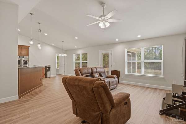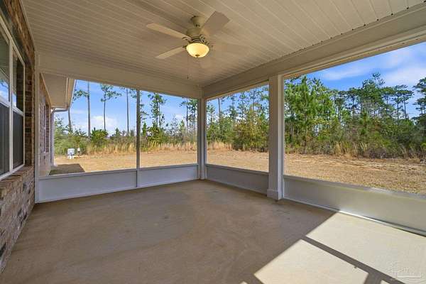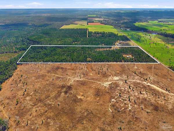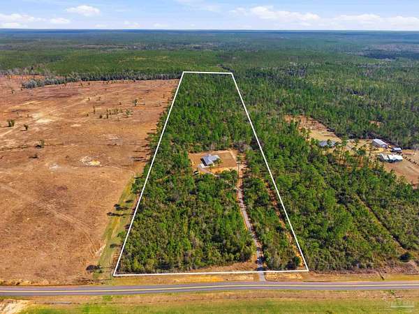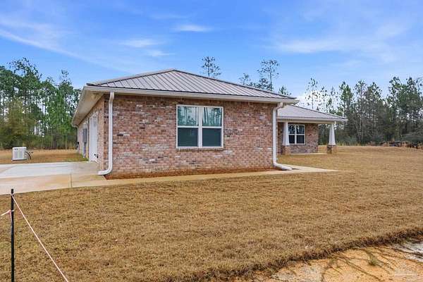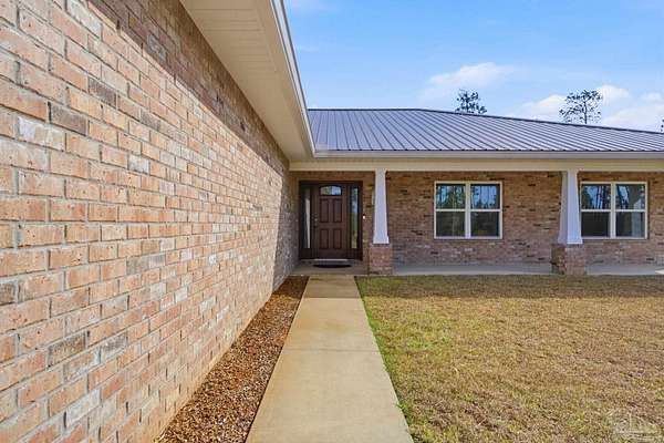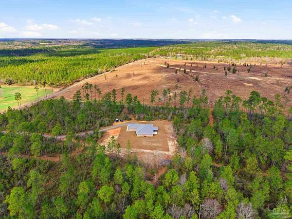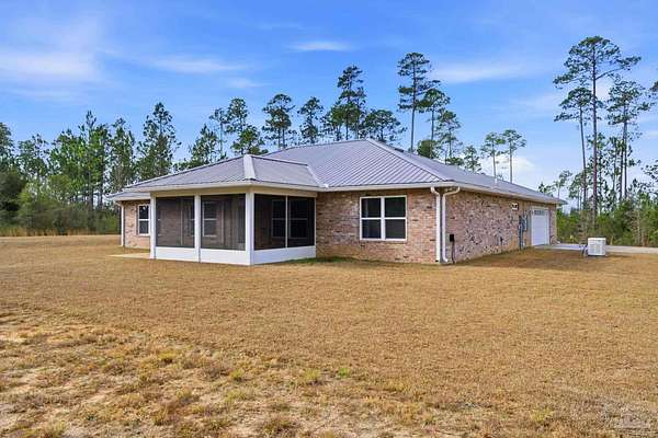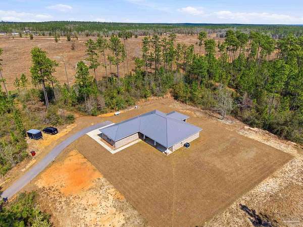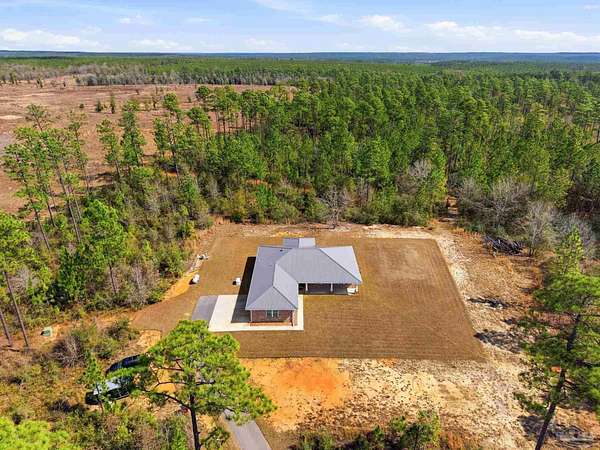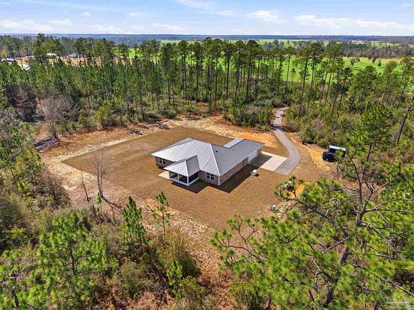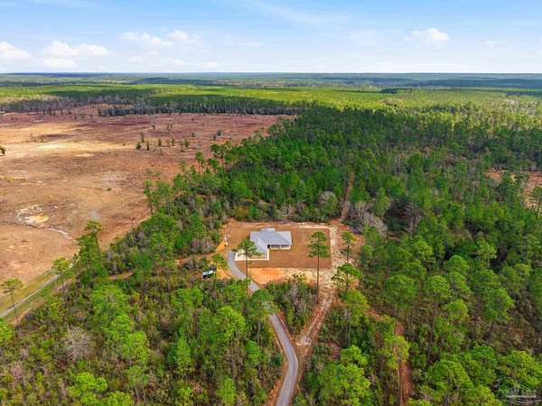 A winding paved drive through the pines leads to 40 acres of pristine privacy and this beautifully crafted 4-bedroom, 2-bath brick home, offering refined rural living just minutes from modern conveniences. Built with quality and intention, this 1,960 SF home features a metal roof, impact-resistant windows, full gutters, an oversized 30x21 side-entry garage, a whole-house generator, a private well, and a sprinkler system - blending durability, comfort, and self-sufficient country peace. Inside, soaring ceilings, recessed lighting, and wood-look luxury vinyl plank flooring create a bright, open atmosphere. The Great Room flows seamlessly into the kitchen and dining area, where oversized windows frame tranquil wooded views and fill the home with natural light. The kitchen is both functional and striking, showcasing granite countertops, custom cabinetry, a hop-up breakfast bar, a farmhouse sink, and stainless steel appliances, including a French Door wall oven, a professional-grade gas cooktop with a built-in griddle, and a custom stainless-steel vent hood - designed for everyday living and entertaining alike. The split-bedroom layout provides privacy for the spacious primary suite, featuring tray ceiling detail and a spa-inspired bath with double vanities, soaking tub, and an oversized tiled walk-in shower with a bench and designer tile accents. Three additional bedrooms offer flexibility, including a fourth bedroom with a closet that easily functions as a home office or bonus space. Step outside to the covered screened porch overlooking your expansive acreage - the perfect setting for quiet mornings and evening breezes. The surrounding 40 acres offer exceptional privacy and room for trails, recreation, or additional structures. Ideally located near Adventures Unlimited, Blackwater River State Forest, Bear Lake, and endless opportunities for hiking, canoeing, and outdoor exploration, this property delivers both seclusion and adventure.