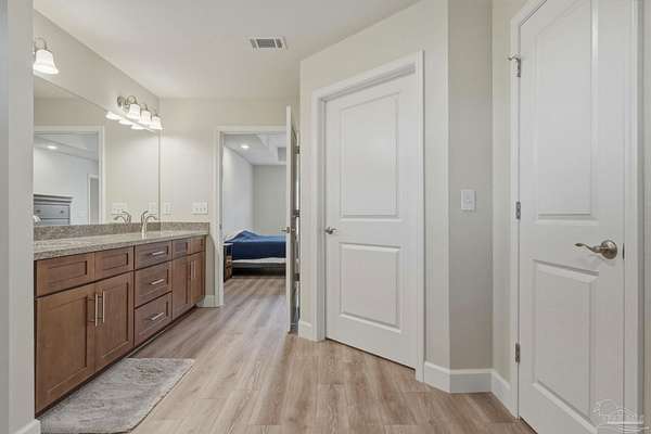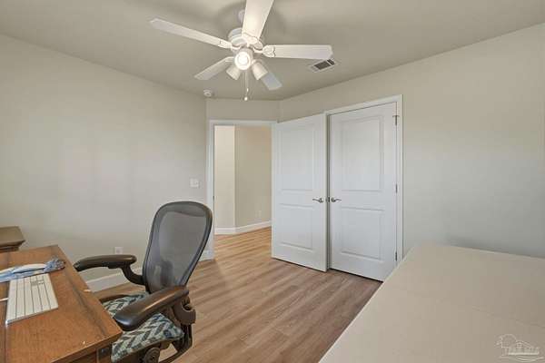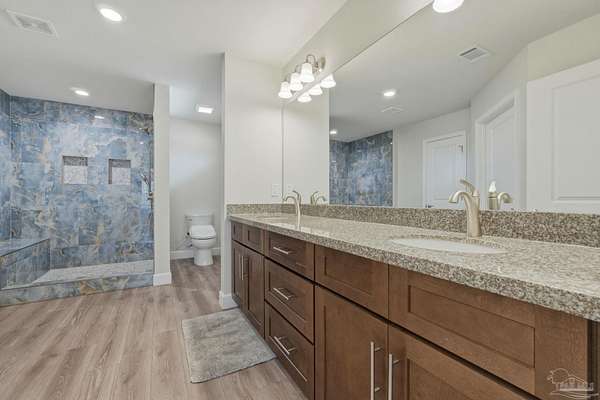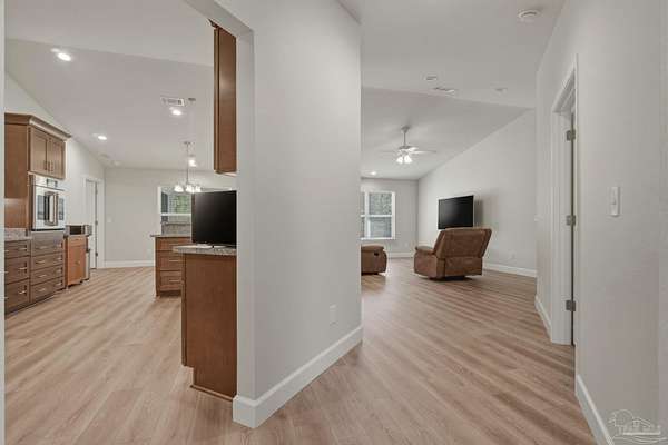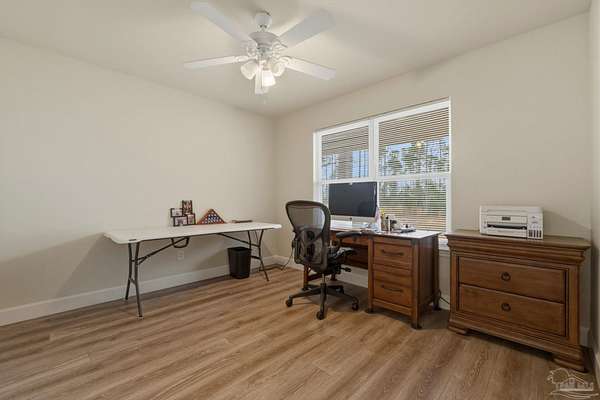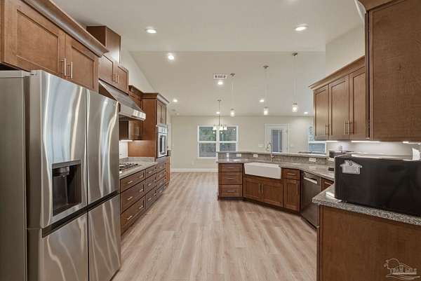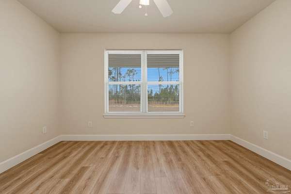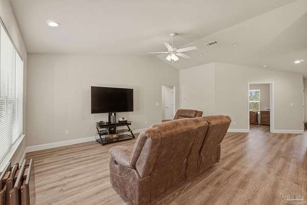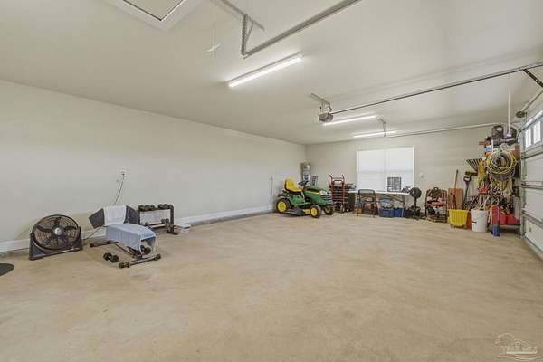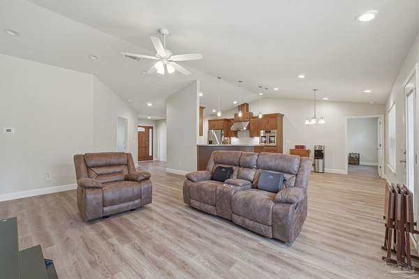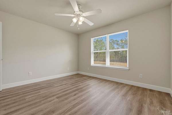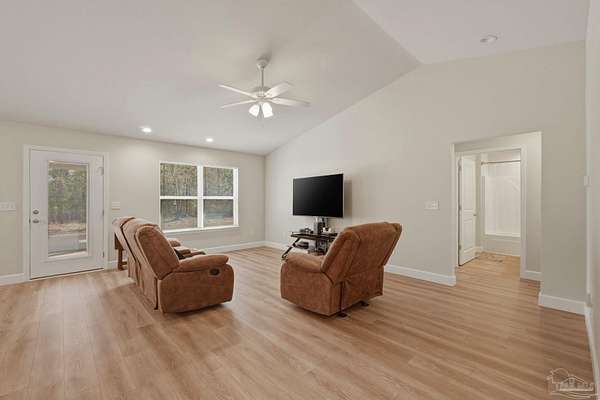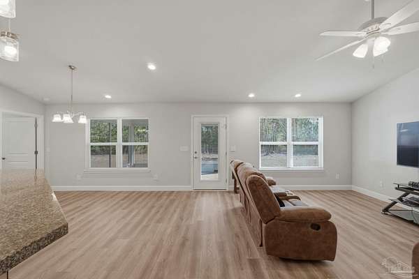 A winding paved drive through the pines leads to 40 acres of pristine privacy and this beautifully crafted 4-bedroom, 2-bath brick home, offering refined rural living just minutes from modern conveniences. Built with quality and intention, this 1,960 SF home features a metal roof, impact-resistant windows, full gutters, an oversized 30x21 side-entry garage, a whole-house generator, a private well, and a sprinkler system - blending durability, comfort, and self-sufficient country peace. Inside, soaring ceilings, recessed lighting, and wood-look luxury vinyl plank flooring create a bright, open atmosphere. The Great Room flows seamlessly into the kitchen and dining area, where oversized windows frame tranquil wooded views and fill the home with natural light. The kitchen is both functional and striking, showcasing granite countertops, custom cabinetry, a hop-up breakfast bar, a farmhouse sink, and stainless steel appliances, including a French Door wall oven, a professional-grade gas cooktop with a built-in griddle, and a custom stainless-steel vent hood - designed for everyday living and entertaining alike. The split-bedroom layout provides privacy for the spacious primary suite, featuring tray ceiling detail and a spa-inspired bath with double vanities, soaking tub, and an oversized tiled walk-in shower with a bench and designer tile accents. Three additional bedrooms offer flexibility, including a fourth bedroom with a closet that easily functions as a home office or bonus space. Step outside to the covered screened porch overlooking your expansive acreage - the perfect setting for quiet mornings and evening breezes. The surrounding 40 acres offer exceptional privacy and room for trails, recreation, or additional structures. Ideally located near Adventures Unlimited, Blackwater River State Forest, Bear Lake, and endless opportunities for hiking, canoeing, and outdoor exploration, this property delivers both seclusion and adventure.