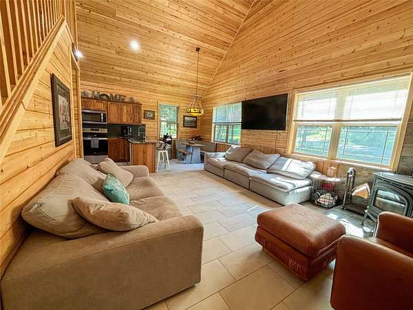 Gorgeous 3-bedroom mountain retreat nestled on 2.85 acres of wooded land. This cabin features a fully renovated Tongue & Groove interior, heated porcelain tile floors, on-demand hot water, new kitchen cabinetry, and appliances. Private setting but easy access to Seeley Lake. Enjoy the spacious 20-foot cathedral ceilings, complemented by a newly installed pellet stove, same great feel as wood without the hassle. Outside, there's a spacious 24 x 32 detached insulated shop/garage. Situated in the sought-after "Resort Town of Seeley Lake," this property is close to all the recreational activities the area has to offer!
