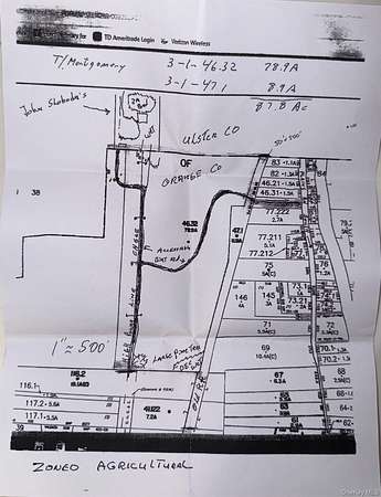 Discover the chance to own 87.8 acres(2 parcels; 78.9 and 8.9 acre lots) of land situated in the charming Town of Montgomery, within the Valley Central School District. This expansive lot presents a unique opportunity for developers, investors, or anyone looking to build their dream home in a serene environment that promises endless possibilities. This picturesque landscape is characterized by mature trees and vibrant wildlife, making it an ideal setting for outdoor enthusiasts. Close proximity to the Lake Osiris Country Club golf course, local parks, Wallkill Rail Trail and just a short drive to shopping centers. With its convenient access to I-84 and NYS Thruway, commuting to nearby cities for work or leisure is hassle-free, making this property not only a tranquil retreat but also a practical choice for daily living. Don't miss the opportunity to make this beautiful piece of land your own!