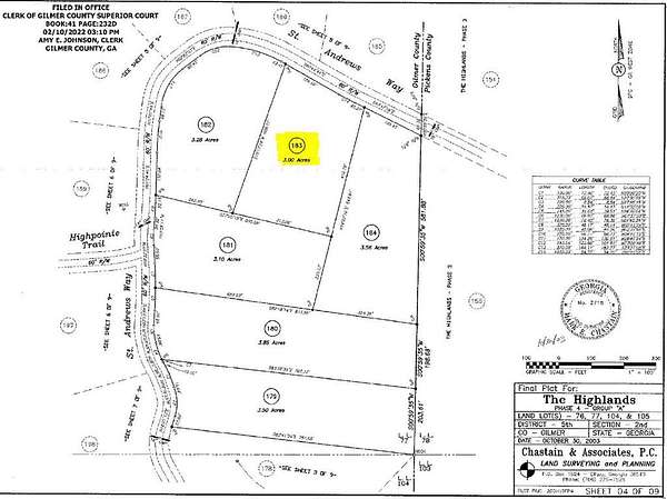 Three acres of flat and gently rolling land in a luxury gated mountain community, offering a quiet and private setting. This nearly square-shaped lot is situated deep within the subdivision, providing excellent privacy. The land begins level at the road and gently rises to a spacious, level building site at the highest point of the lot, perfectly positioning a future home above the road and creating natural privacy. From there, the terrain slopes gently toward the rear of the property. Seasonal mountain views are present. Underground utilities including electric, power, cable, and internet are available at the road. Georgian Highlands is a luxury gated mountain community in the North Georgia mountains, featuring wide paved roads that meander through hardwood forest with a state park-like feel. The community offers reasonable HOA fees and quick access to Hwy 136 E and Hwy 52 E, with Jasper and Ellijay each approximately 20-25 minutes away. Nearby attractions include apple orchards, wineries, U-Pick farms, mountain hiking trails, and seasonal destinations such as sunflower and pumpkin fields. GATED, HOA, no short term rentals, minimum 2000 sqft, all buyers must be with an agent.