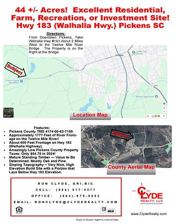 Estate sale! Major Price Improvement!! Now offered below appraised value by Ron Clyde/Clyde Realty, LLC 44 +/- Acre parcel, Ideal hunting or recreational site with high build sites fronting along the 12 Mile River in Pickens, SC. Unrestricted, unimproved, with unlimited uses. Several businesses are located in near proximity to the subject including the Pickens County Flea Market located directly across the highway. Offered as a whole, will not sub-divide. The parcel is located just outside the incorporated area of the City of Pickens, with approximately 1776 feet fronting on the Twelve Mile River and about 595 feet fronting on Hwy 183, aka the Westminster Highway. There is a high elevation area on the westernmost section of the parcel ideal for a single lodge or about 3 to 5 residential sites. Access from Highway 183 to the high elevation area appears to require travel over a section of AE Floodplain (or across adjacent property owner’s land). Much of the parcel lies within the Floodplain. Standing timber values have not been evaluated.