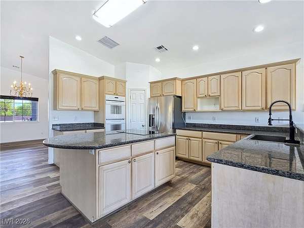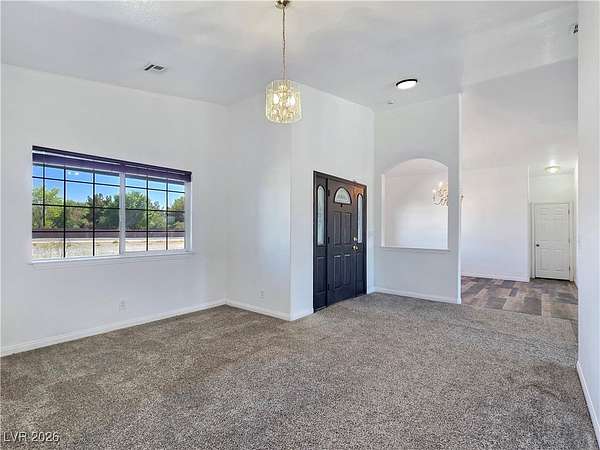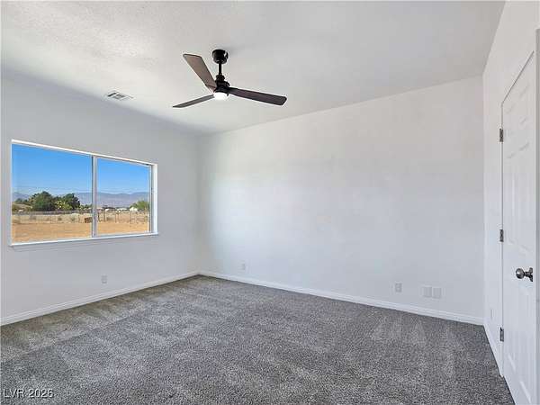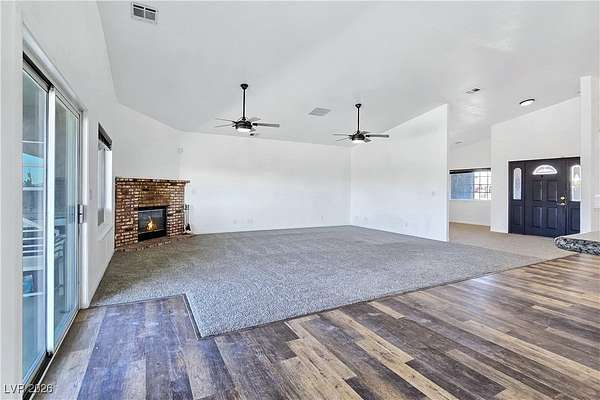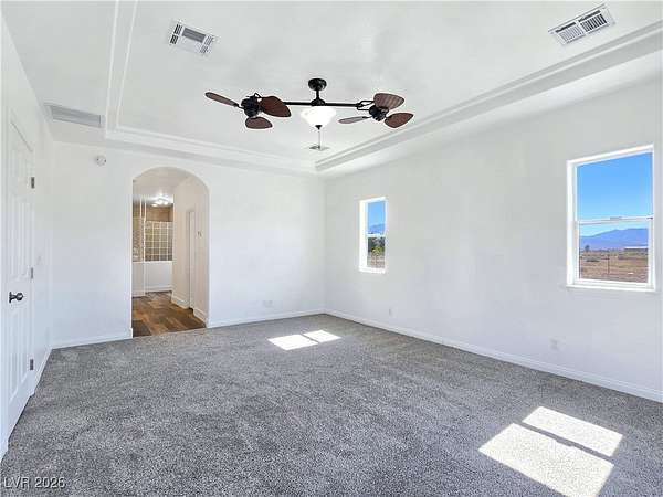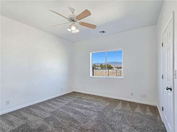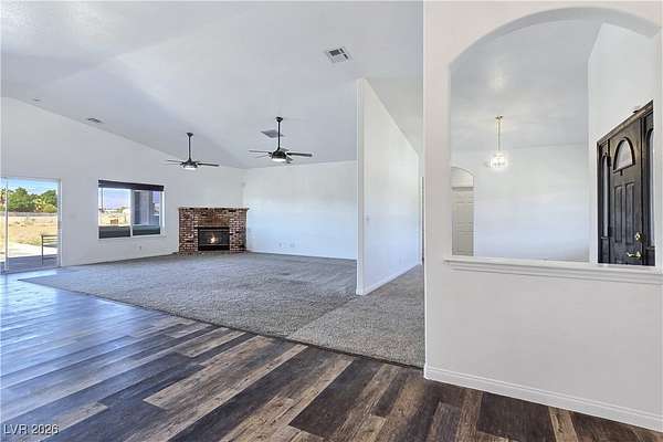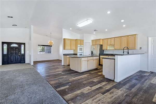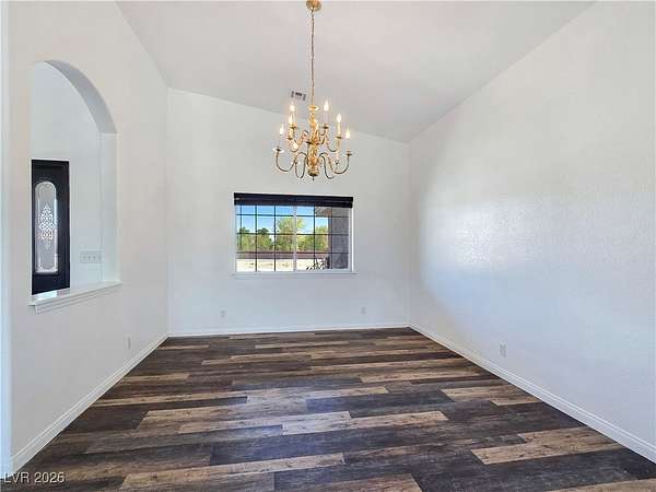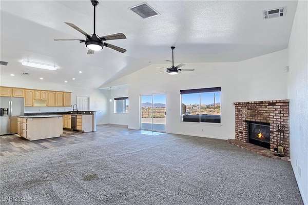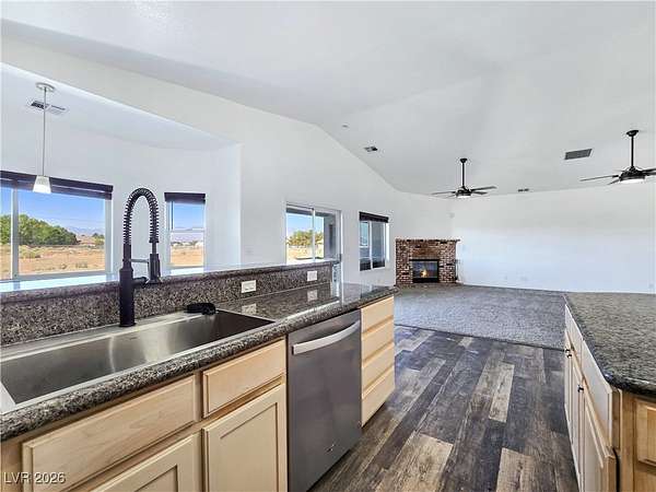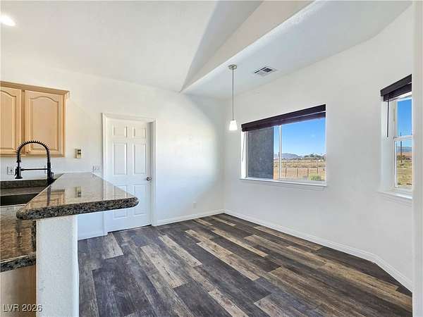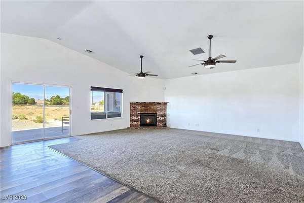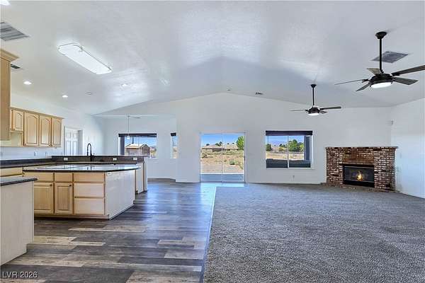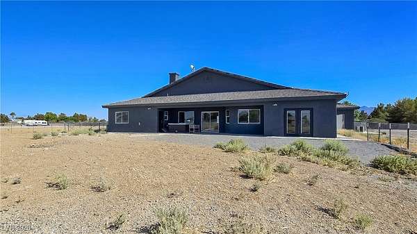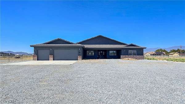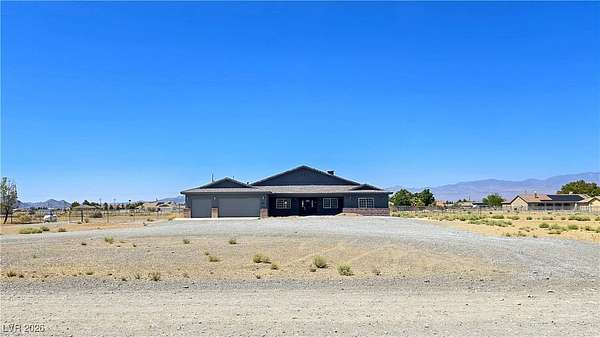 Truly unique semi-custom estate on over 2.3 acres with RV parking! As you enter the home, you are greeted with a dramatic entry with vaulted ceilings and open floor plan. Chef's kitchen is a masterpiece boasting custom cabinets, granite counters, island, breakfast bar, dining nook, stainless appliances and pantry, overlooking the family room with a stone wood burning fireplace great for entertaining. Formal dining room. Laundry room with cabinets for extra storage. Window coverings throughout. 4 bedrooms and 3 bathrooms. The primary bedroom is showcasing the primary bath with a huge walk-in closet, soaking jacuzzi tub, shower, double sinks and makeup vanity. Oversized 3 car garage. Breathtaking views of Mount Charleston from your backyard!