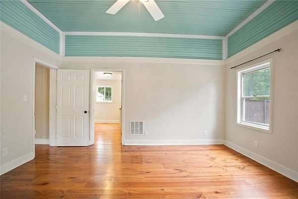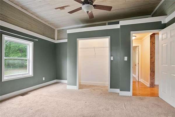 OWNER FINANCING AVAILABLE!5.25 acre level lot! This adorable and thoughtfully preserved farmhouse blends historic charm with contemporary updates. Featuring a classic white exterior accented by traditional black shutters, a distinctive standing seam metal roof and a welcoming front porch, this home is ready to capture your heart. Inside enjoy 10 foot ceilings and timeless architectural details. Original features such as the double sided non-functioning fireplace, 3/4 inch by 4 inch beaded pine walls and heart pine flooring honor the home's historic craftsmanship. Enjoy morning coffee or relaxing evenings on the expansive covered back porch. Surrounded by mature trees including oak and black walnut, lush greenery, and flowering shrubs, the property offers peaceful privacy just minutes from local amenities. Whether you appreciate historical character or envision adding your personal touch, this home offers endless possibilities. Outside entry basement is a hidden gem, with tons of space! Seller is offering owner financing to qualified buyers.