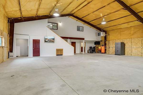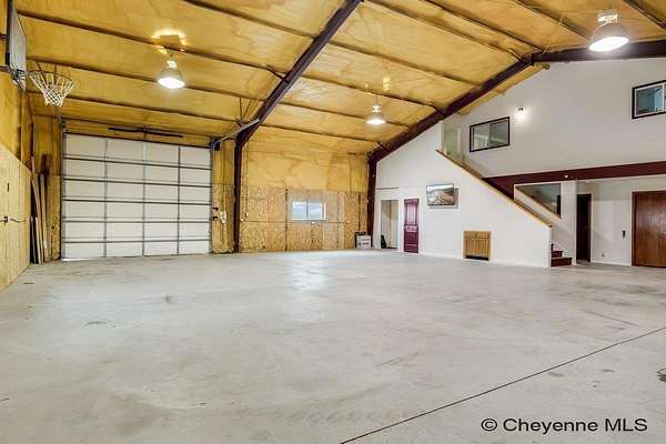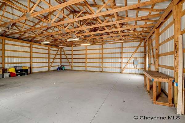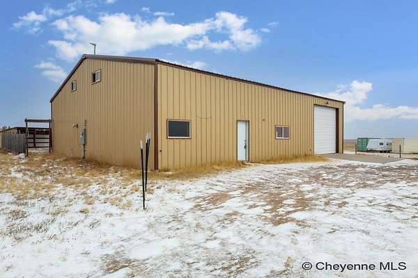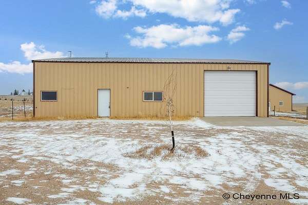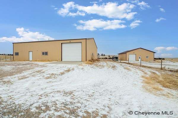 A rare opportunity to own a versatile shop home set on 9.60 acres just north of Cheyenne! The primary 60' x 50' outbuilding has comfortable living quarters and exceptional work space. The main level features a large kitchen, an office or flex room, a three-quarter bathroom with laundry. Upstairs, you'll find the private living quarters, including a bedroom, half bath, and a cozy living room area. The property also includes a second 40' x 40' outbuilding with concrete floors. Both outbuildings are equipped with overhead doors, allowing easy access for vehicles, trailers, or machinery. There is also a lean-to for animals, a small greenhouse and the property is fenced. With wide-open space and incredible potential, this is an amazing opportunity to own a truly one-of-a-kind shop home!