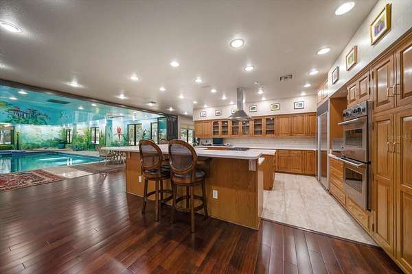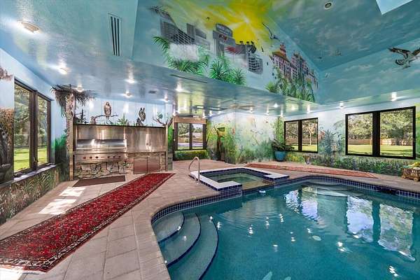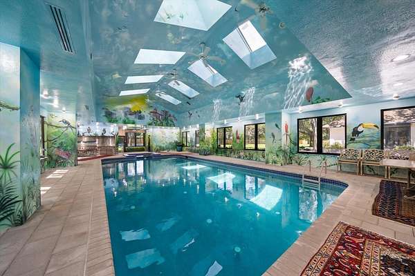 Prepare to be amazed by this extraordinary estate home tucked within Kent Place--one of Clearwater's most coveted and private neighborhoods, where country-style living meets city convenience. Designed with vision and created with care, this home is a true masterpiece, ideal for car collectors, art lovers, or multigenerational living. Pride of ownership is evident from the moment you arrive, with impeccable landscaping, majestic oaks, and a stately executive presence. Step inside to a gallery-style foyer that sets the tone for the home's artistry and attention to detail. Just beyond, the Key West-inspired room transports you to the southernmost point of Florida with hand-painted murals, skylights, and a wall of floor-to-ceiling windows--a serene escape unlike any other. Entertain in style with a full wet bar leading to a cozy family room with fireplace and cigar cabinet and wine cellar, open to a chef's kitchen featuring top-of-the-line stainless steel appliances, a center island with vent hood, and access to one of the home's showstoppers: an enclosed indoor pool and spa surrounded by custom murals of Tampa Bay's iconic landmarks. A commercial Wolf grill ensures unforgettable gatherings. The pool can be closed off and separated by glass, accordion sliders. The formal living and dining rooms are a work of art themselves, featuring custom wall murals and grand spaces perfect for hosting intimate dinners or entertaining on a grand scale. The primary suite is a world of its own, complete with a private office featuring a poured concrete safe, a second laundry, a sitting room with custom built-ins, a spa-like ensuite with jetted tub, walk-in shower, double vanities, and an unforgettable custom closet with lighted glass cabinetry, endless storage, and a substantial staircase leading to a cedar-lined closet. Guests will marvel at the castle-like guest suite with soaring ceilings, a whirlpool tub, walk-in shower, steam room, and sauna. Two additional bedrooms with walk-in closets and natural light share a Jack-and-Jill bath. An attached two-bedroom, two-bath apartment with full kitchen and theater room offers the perfect solution for a nanny, in-laws, or long-term guests. For the car enthusiast, a 6 bay garage with four car lifts allows for storing 10-cars. A dream come true, while a separate 3-car garage provides additional storage and access to a large laundry room. Hurricane impact windows with shutters, two home generators that will power a significant portion of the home, storage galore, and custom features around every corner make this a once-in-a-lifetime opportunity to own a truly remarkable Clearwater estate. Ideally located close to shopping, dining, two airports and pristine beaches .Don't miss your chance--homes like this are rare and unforgettable!