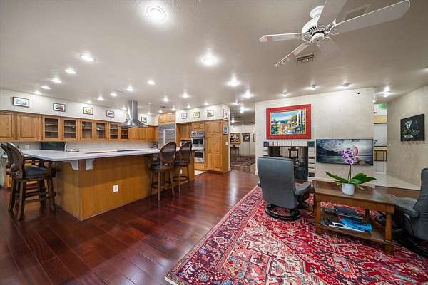 - Built-In Features, Ceiling Fans(s), Central Vaccum, Crown Molding, Eat-In Kitchen, Kitchen/Family Room Combo, Open Floorplan, Sauna, Solid Surface Counters, Solid Wood Cabinets, Split Bedroom, Stone Counters, Thermostat, Walk-In Closet(s), Wet Bar