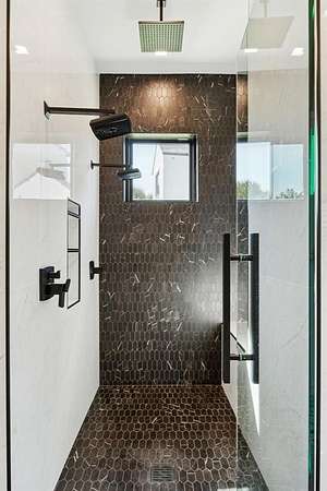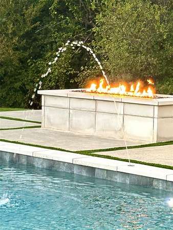 Seamless indoor-outdoor living opens to a covered patio with retractable screens, fireplace, patio heaters, insect mister, and outdoor kitchen. The backyard is a private resort-style oasis featuring a custom diving pool, water features, tanning ledge, hot tub, outdoor shower, and fire pit—ideal for entertaining or relaxing in tranquility. Flex room on second floor is currently used as a second office but can be a 5th bedroom.
