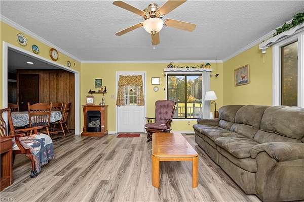Welcome Home to this warm and inviting one owner ranch home in Fentress area of Chesapeake. This home sits on 3.29 gorgeous, mostly cleared acres and comes with an additional 1.79 acres that will also convey. It backs up to the Pocaty River. It does not appear to be in a high-risk flood zone but please verify. There are 4 outbuildings (All Convey As IS). A one car detached garage, an oversized detached garage and two sheds. The kitchen and the sun room are spacious. The primary bedroom is big with a walk-in closet! Bonus/Flex room by kitchen could be office/workout space/small bedroom, you choose! This home was lovingly cared for and is good condition overall. Roof 2018, Windows 2000, H20 2015, HVAC 2019. Home needs updating, major systems in good shape. Air rights have been sold. This will impact future use of property. Buyers, please do your own due diligence. Tired of paying HOA dues and neighbors too close, here's your chance to live in the country on acreage!