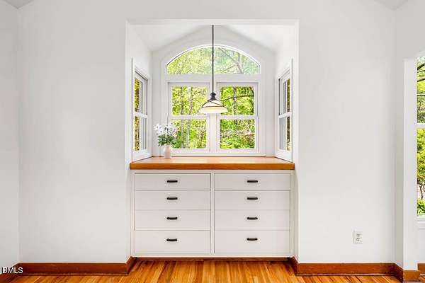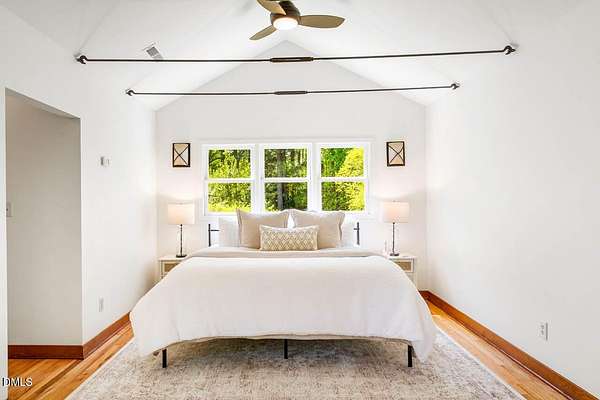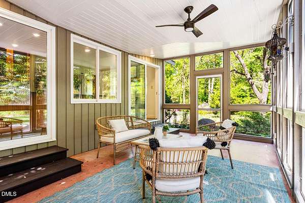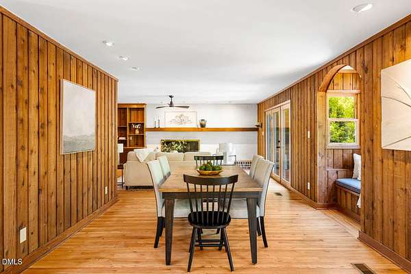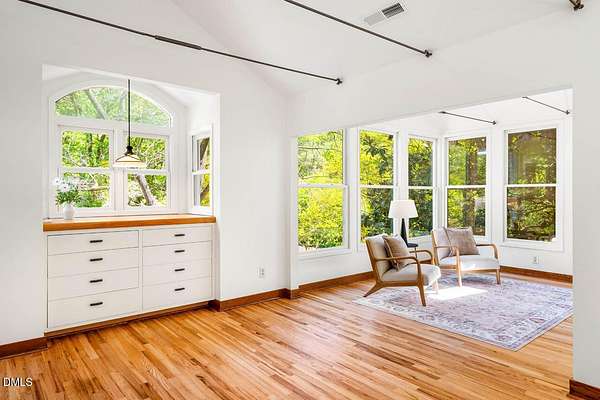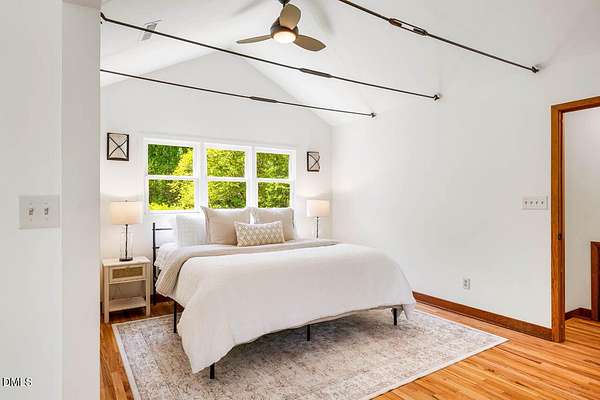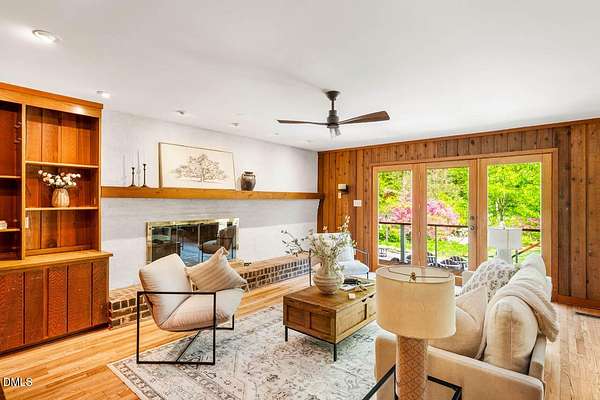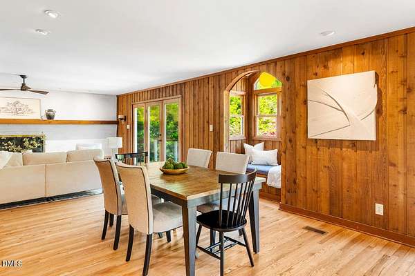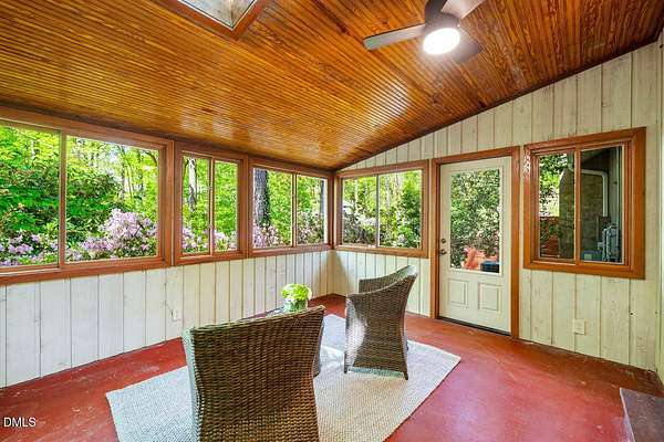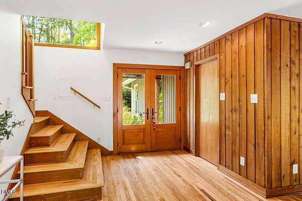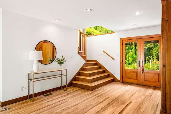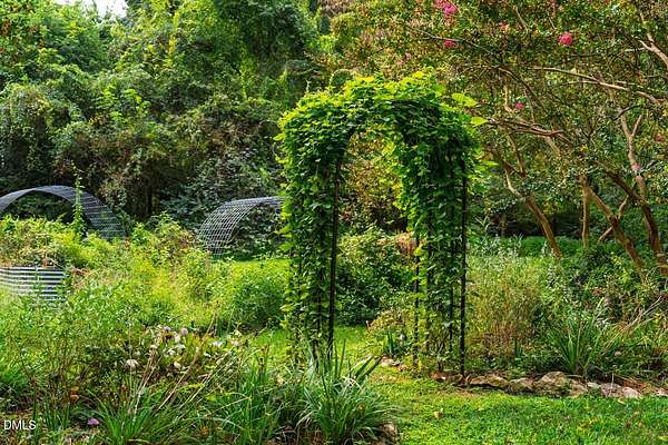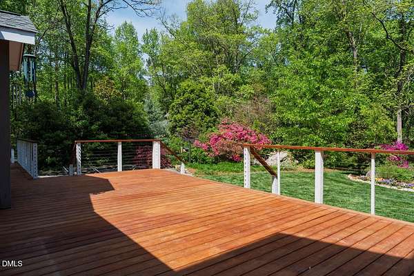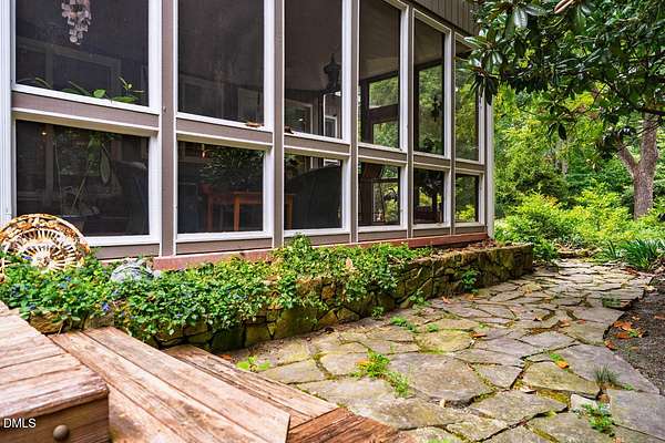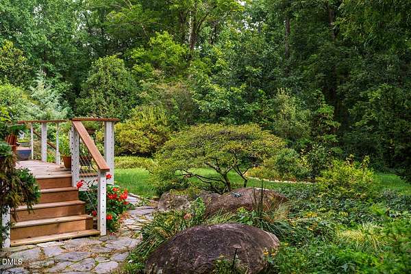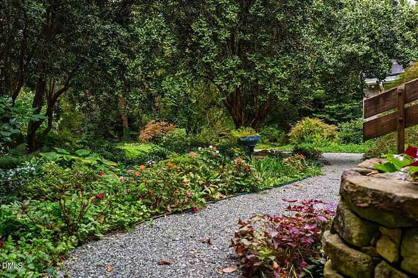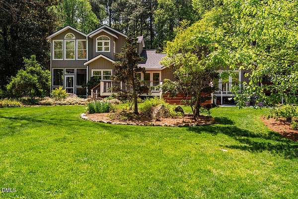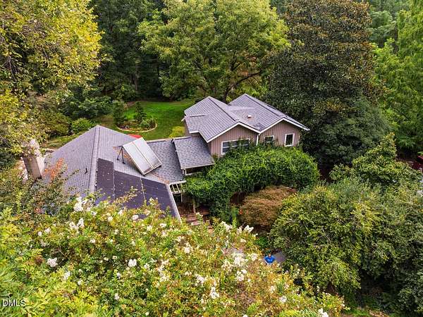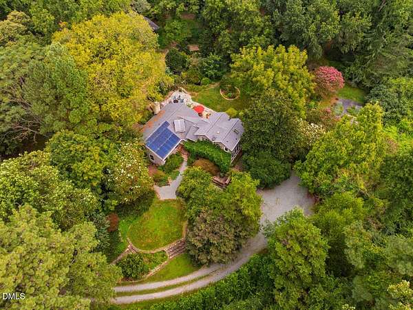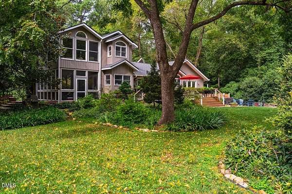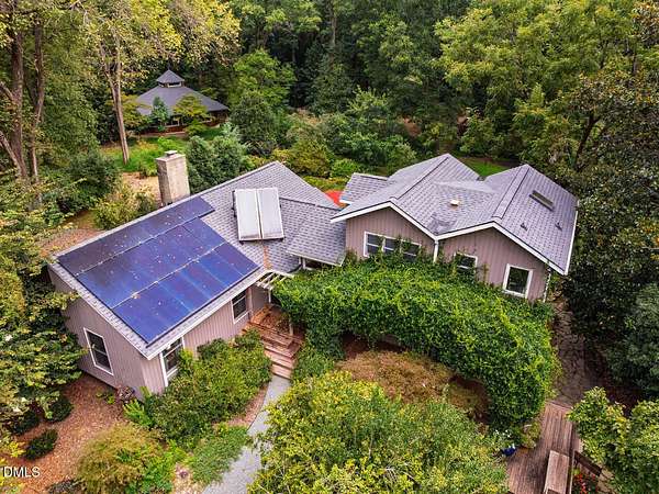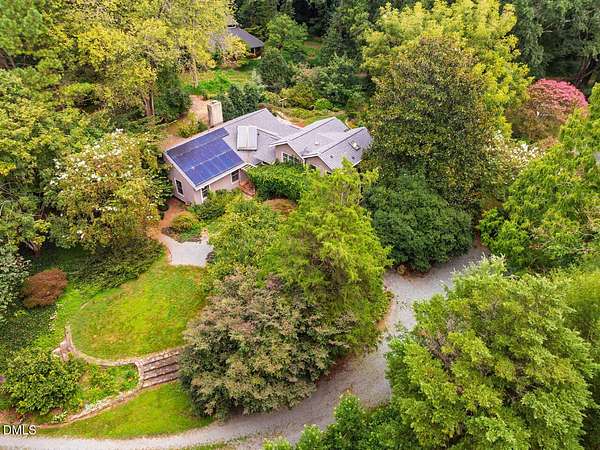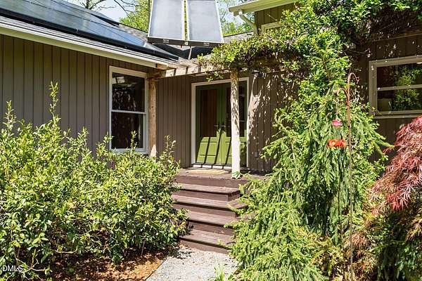 A rambling garden estate minutes from shops, restaurants and UNC. Step into this home that has been lovingly renovated by owners for years. Stunning updates - kitchens, baths, refinished hardwood floors and all fresh paint. Multiple entertaining spaces both inside and out. Lots of big open decks, screened porch, garden seating, stone fire pit next to the water feature. Kitchen has all new Bosch stainless steel appliances and the best eat-in cafe seating! Two Primary Bedrooms - upstairs and down. First floor opens to it's own screened porch and the second upstairs with additional seating area. Photo voltaic panels send power back to the grid and discounts your bill. Solar hot water heater. Hot tub on the patio right next to the outdoor shower. New roof (2022). 2.5 private acres on which to live your Carolina Dreams. Shared driveway and well. New septic. Top Chatham County schools including N Chatham Elementary, Pollard MS and Seaforth HS! Make sure you book enough time for your visit because you should sit and listen to the birds for a while and help yourself to a drink from the new fridge.
