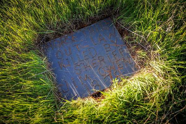 The second outlaw was buried at the spot where he fell. By that time, the other outlaw was dead and was brought and buried by the other one. A head marker was made for both graves by splitting a block of cedar. Years later, Andrew Martin of Lone Camp passed by the graves one day and noticed that one of the markers was almost rotted away. He visited the two sons of Sheriff Owens and got the dates of the killing. He carved two stones with the dates on them and replaced the wooden markers. When you see this ranch, ask Brandon to show you the historic site.