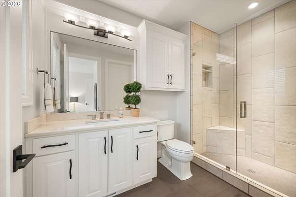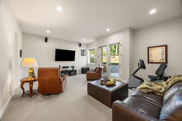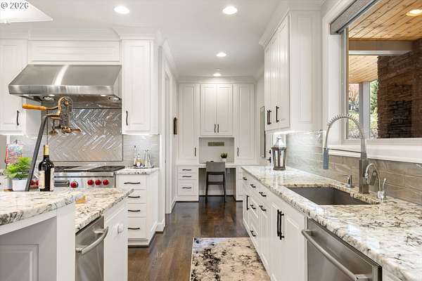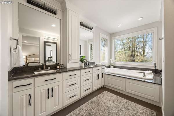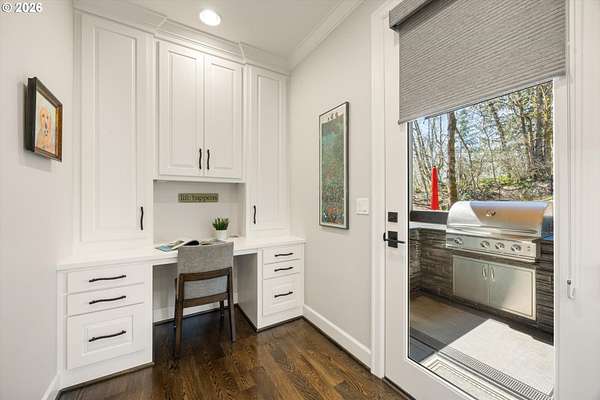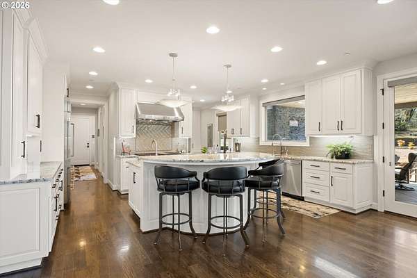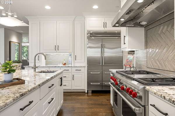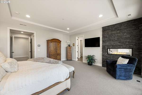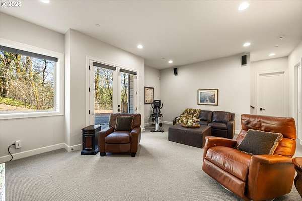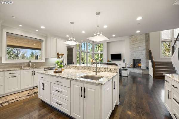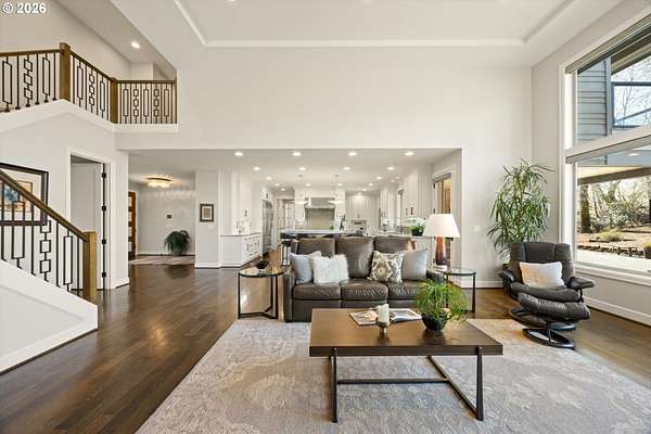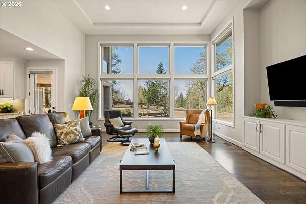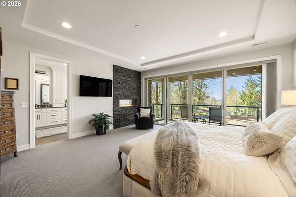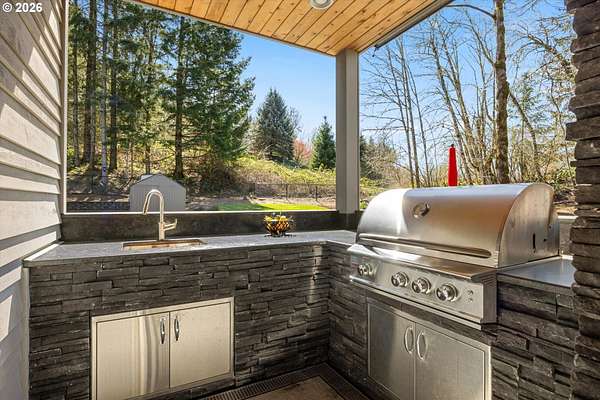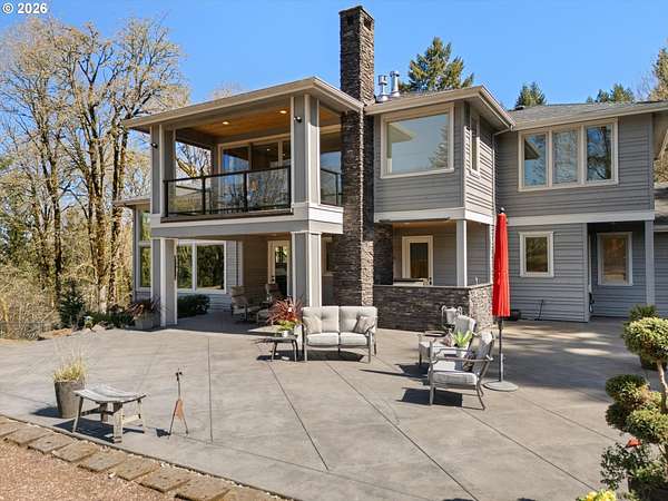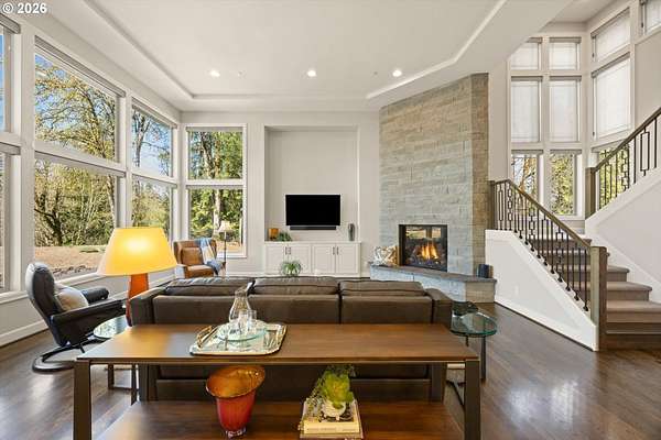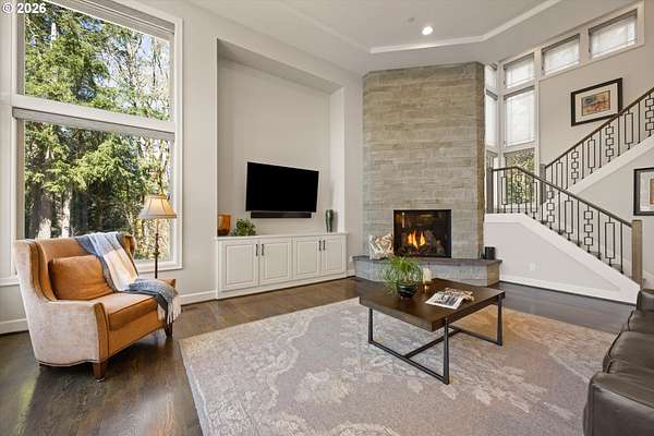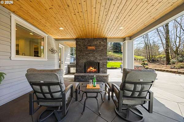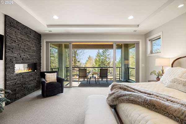 Sitting on nearly two private acres with direct access to surrounding forested trails, this exceptional estate offers a rare blend of scale, privacy, and elevated Northwest living. A circular drive creates a grand arrival, leading into soaring 14-foot ceilings, walls of windows, and a dramatic floor-to-ceiling stone fireplace that anchor the main living spaces with both warmth and presence. The chef's kitchen is fully equipped with Sub-Zero and Wolf appliances, double ovens, prep sink, walk-in pantry, and an oversized eat bar, designed for both everyday living and effortless entertaining. A main-level bedroom with en suite provides flexibility, while the upper-level primary suite is a true showpiece, featuring a private balcony, double-sided fireplace, and a striking, spa-level bath with a jetted soaking tub designed for two and a triple-head shower, along with an expansive walk-in closet. The lower level offers additional living space with a separate entrance, generous storage, and ideal potential for a wine cellar or expanded suite with room to convert the existing half bath to a full. Outdoor living is exceptional, featuring a massive patio with a dramatic stone fireplace, built-in kitchen, dedicated garden with raised beds, beautifully landscaped yard, and storage shed. A full-house Generac generator, smart home features, central vac, custom built-ins, and a striking entry with water feature complete this one-of-a-kind offering.
