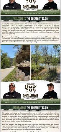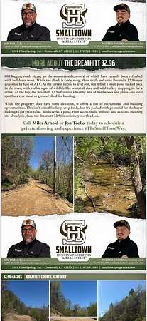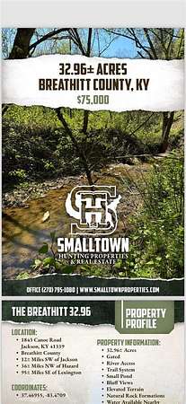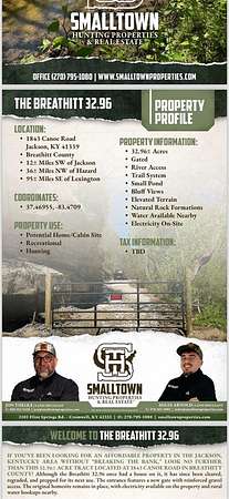 IF YOU’VE BEEN LOOKING FOR AN AFFORDABLE PROPERTY IN THE JACKSON, KENTUCKY AREA WITHOUT “BREAKING THE BANK,” LOOK NO FURTHER THAN THIS 32.96± ACRE TRACT LOCATED AT 1843 CANOE ROAD IN BREATHITT COUNTY! Although the Breathitt 32.96 once had a house on it, it has since been cleared, regraded, and prepped for its next use. The entrance features a new gate with reinforced gravel access. The original homesite remains in place, with electricity available on the property and rural water hookups nearby. There’s an excellent building site ready for a new home or cabin, and a mobile home would also be a great option. The homesite is tucked against the backdrop of Kentucky’s beautiful Appalachian Mountains and overlooks a scenic creek that flows directly into the Middle Fork of the Kentucky River. You can literally walk across the road and go fishing! Old logging roads zigzag up the mountainside, several of which have recently been refreshed with bulldozer work. While the climb is fairly steep, these trails make the Breathitt 32.96 very accessible by foot or ATV. As the terrain begins to level out, you’ll find a small pond tucked back in the trees, with visible signs of wildlife like whitetail deer and wild turkey stopping in for a drink. At the top, the Breathitt 32.96 features a healthy mix of hardwoods and pines—an ideal spot for a tree stand or ground blind for hunting. While the property does have some elevation, it offers a ton of recreational and building opportunities. This isn’t suited for large crop fields, but it’s packed with potential for the buyer looking to get great value. With creeks, a pond, river access, trails, utilities, and a cleared building site already in place, the Breathitt 32.96 is definitely worth a look. Call Miles Arnold or Jon Toelke today to schedule a private showing and experience #TheSmallTownWay