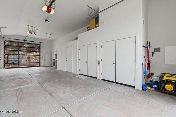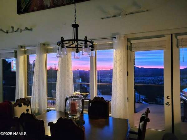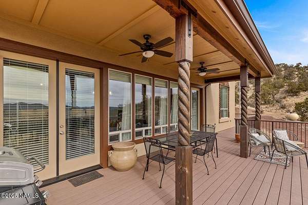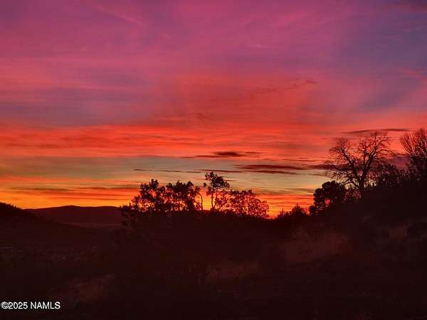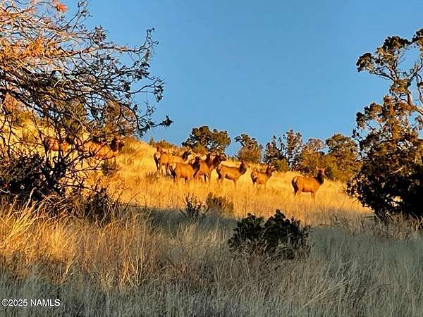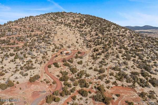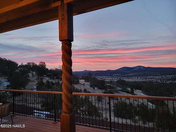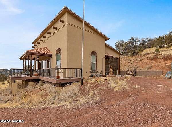 Stunning panoramic views and amazing privacy awaits you! On a 13.73 acre lot this hillside home is bathed with southern exposure! Passive solar can add to your comfort in winter and at 6,900 feet of elevation (with AC) adds to your summer enjoyment. When entering the home, you will be enveloped by natural light and with 22-foot-high ceilings (12-feet in bedrooms) the home feels spacious. Extraordinary details such as concrete flooring, raw edge Mesquite wood fireplace mantle, Granite Moon White countertops in the kitchen, stainless-steel appliances, tons of custom cabinets and beautiful tilework in each bathroom. The exterior is Stucco (synthetic), hand-carved Santa Fe turned wood posts and sunbursts above the windows, clay tiles and metal roof and an absolutely amazing deck for viewing wildlife, Kaibab and BLM National forests. The deck is the perfect place for stargazing, sunrises and sunsets, what great photographs you can take! There are 4 separate RV hookups, one which is in the huge pull-thru garage (11ft high aluminum and Lexan glass doors) park a trailer inside and make a wonderful extra bedroom! This central location is 15 mins to the charming historic Rt 66 town of Williams, 40 mins to the Grand Canyon, 30 mins to Flagstaff and in the middle of all that Northern AZ offers! All furnishings, outdoor furniture, workshop and garage items available for sale outside of escrow.