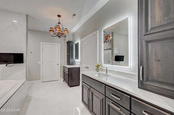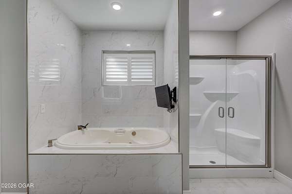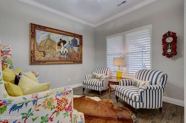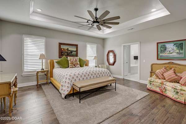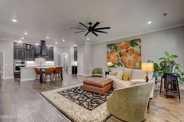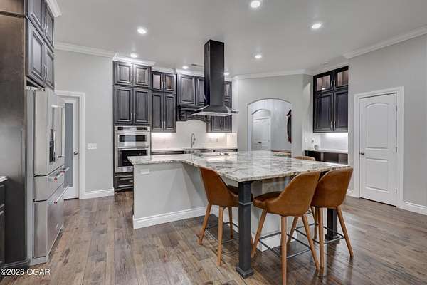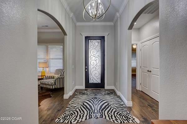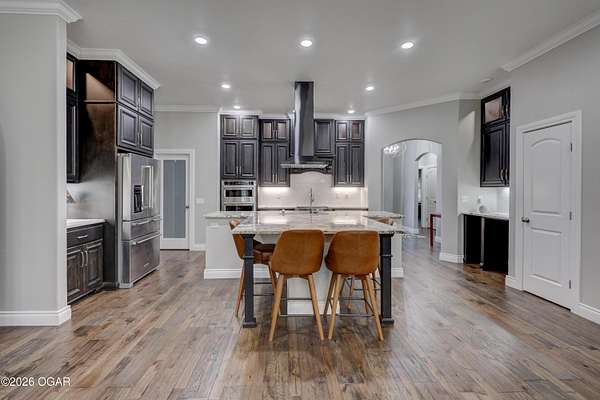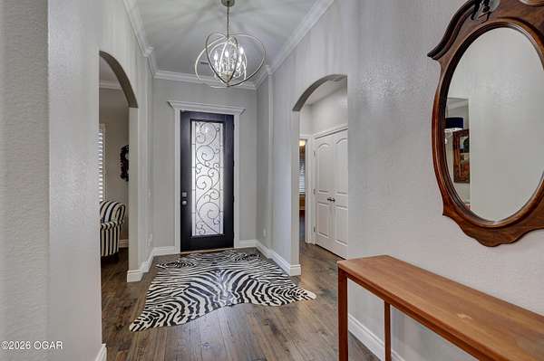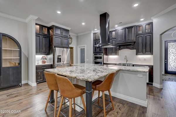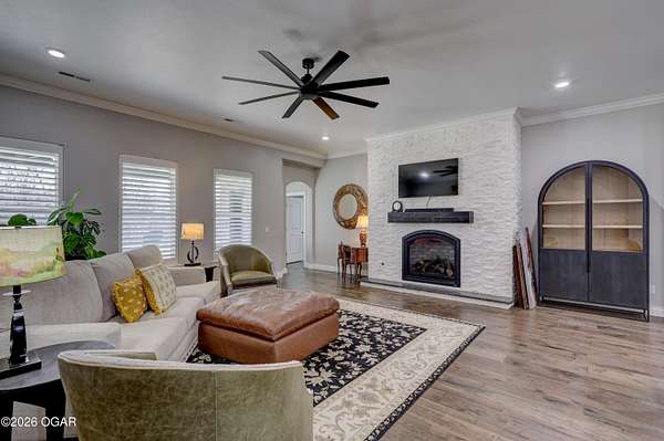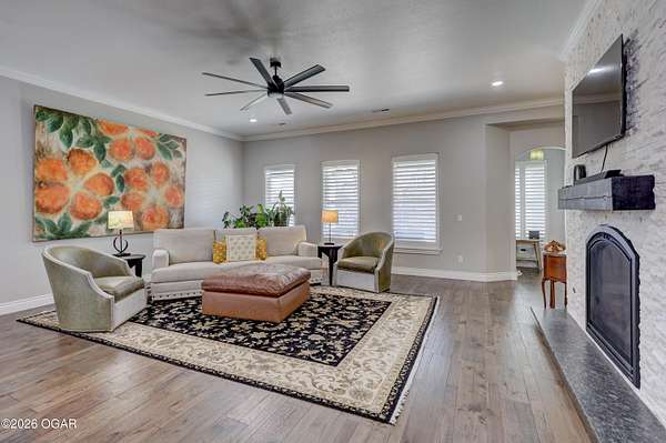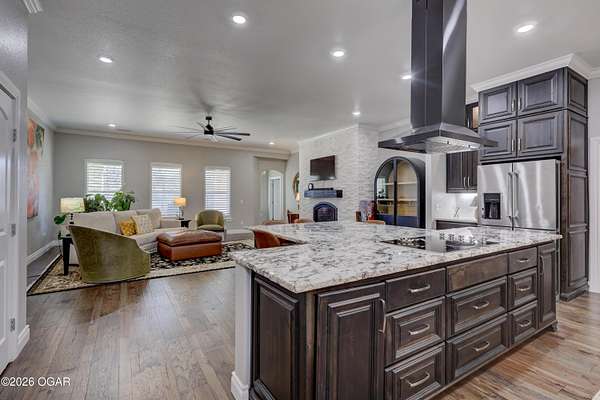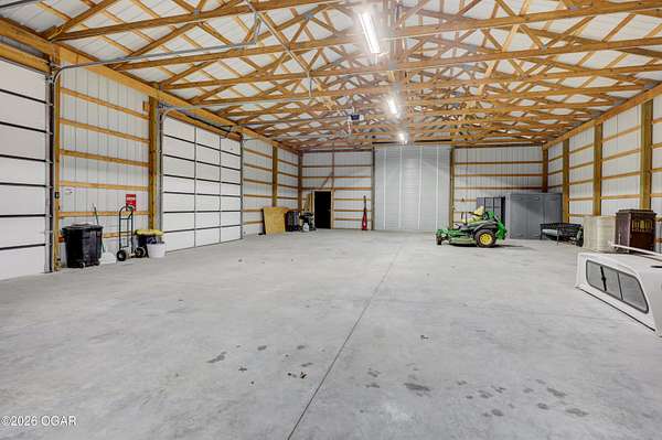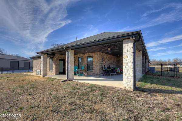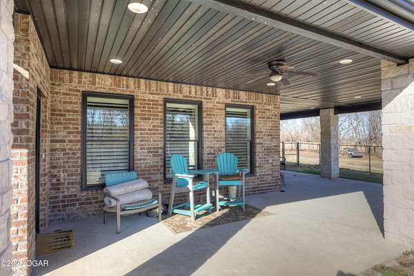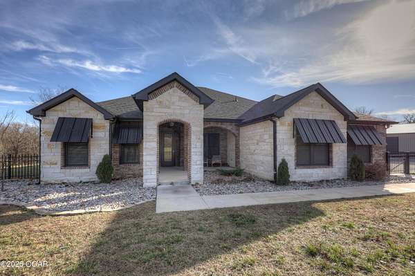 Start your adventure here in this gorgeous, move-in ready home that sits on over three acres. The chef's dream kitchen has center cooking island, Kitchen Aid appliances, walk-in pantry and roll out drawers in the custom Twin Oaks cabinetry. The living room is open to the kitchen and features a gorgeous stone gas fireplace and built-in cabinetry. The primary suite has over 500 square feet and has a spectacular bathroom with separate tub and shower, double vanities with LED mirrors, massive closet and direct access to the laundry room. Other features of the home include hard surface flooring and granite or quartz countertops throughout, new HVAC, wraparound covered patio and fenced yard. There's also a 60x40 shop with 3 overhead doors, storage, electricity and large storm shelter. This is truly a rare find!