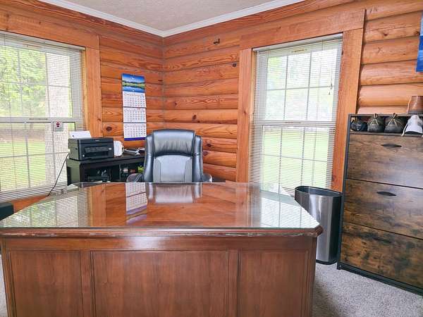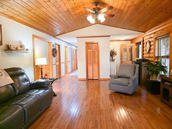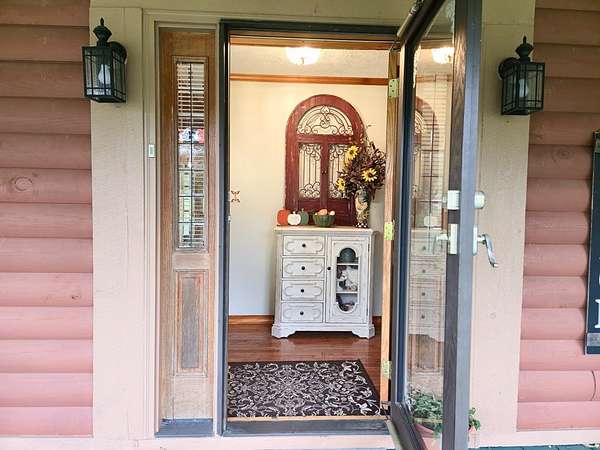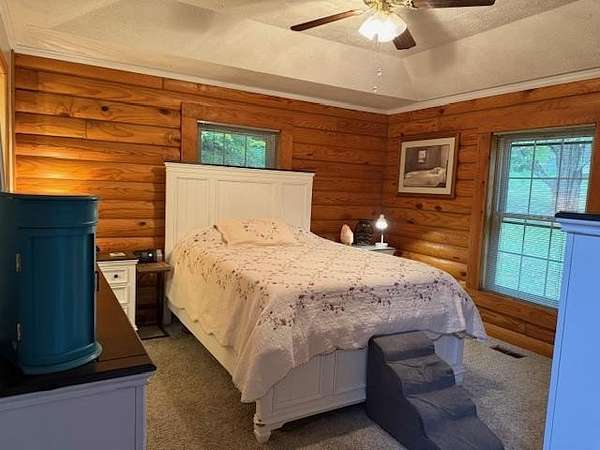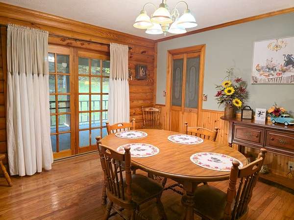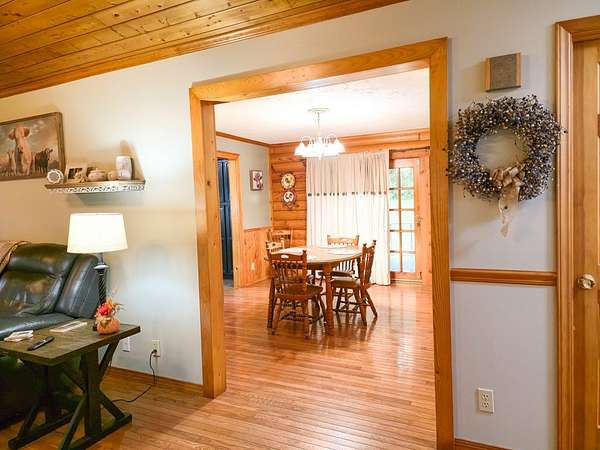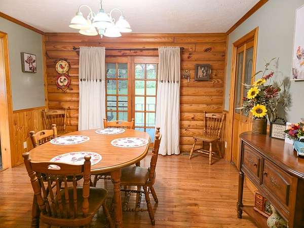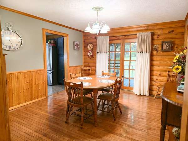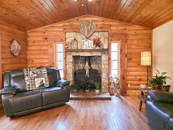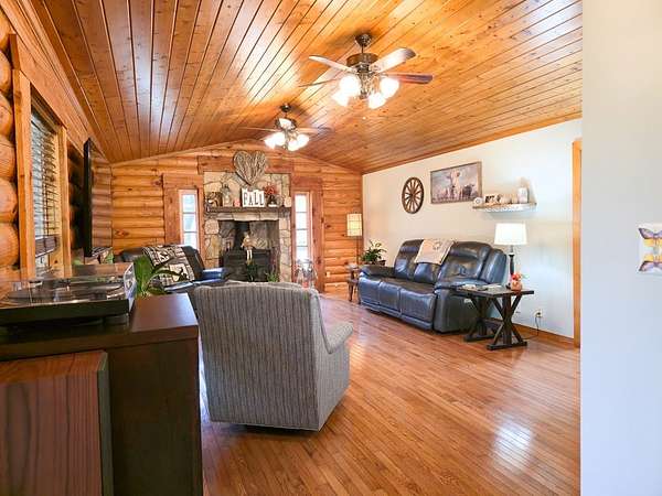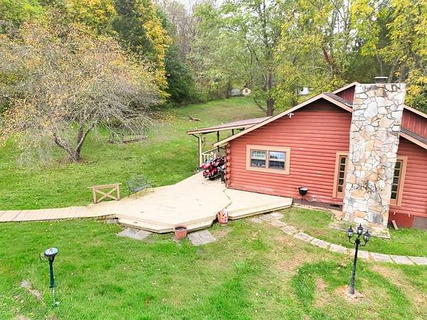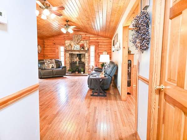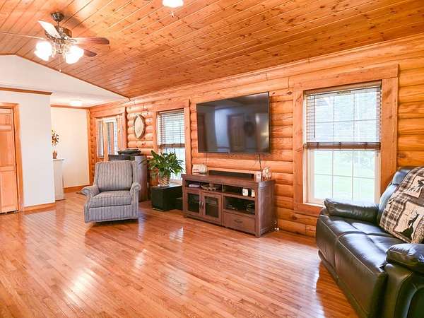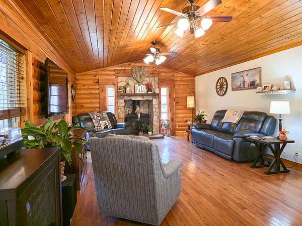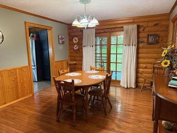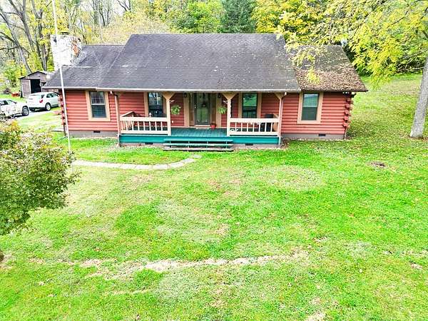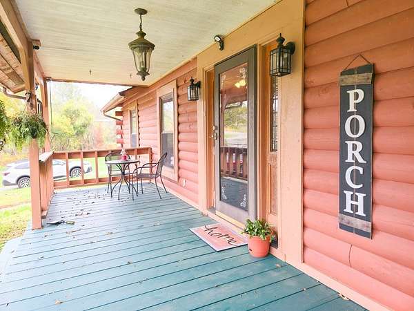 Welcome to this beautiful 3-bedroom, 2-bath log home nestled on 4.2 peaceful acres in Tazewell County, VA! From the moment you arrive, you'll be charmed by the inviting covered front porch, perfect for relaxing and taking in the scenic surroundings. Step inside to a quaint foyer that flows seamlessly into the spacious living room, featuring warm wood floors, two ceiling fans, a stone fireplace with wood stove, and a stunning vaulted wood ceiling that enhances the rustic charm of the home. The dining room continues the theme with wood flooring, chair rail, wainscoting, crown molding, and atrium doors that open to a covered rear porch-an ideal spot for entertaining or enjoying the quiet countryside. The kitchen has been nicely updated with new countertops, refinished cabinets, and newer appliances including a dishwasher and refrigerator, plus a range and microwave. The vinyl tile flooring adds easy maintenance and modern comfort. The primary bedroom offers a cozy retreat with carpet flooring, a tray ceiling, ceiling fan, crown molding, and a walk-in closet. The ensuite bathroom features vinyl tile flooring, a tub/shower combo, large vanity, and a linen closet. The second and third bedrooms also have carpet flooring, closets, and beautiful trim details. The full hall bathroom includes a tub/shower combo, vanity, and vinyl tile floors. Throughout the home, you'll find gorgeous wood accents, insulated windows, and gutters. Additional features include a heat pump, UV light on the well, and a private septic system. Out back, enjoy the covered rear porch with a ceiling fan for added comfort, which leads to an open deck-perfect for outdoor gatherings or soaking in the peaceful setting. There is also an old home on the property currently used for storage, being sold AS-IS. This log home offers the perfect blend of rustic charm and modern comfort-all in a serene country setting. Don't miss your chance to make this slice of Virginia countryside your own!