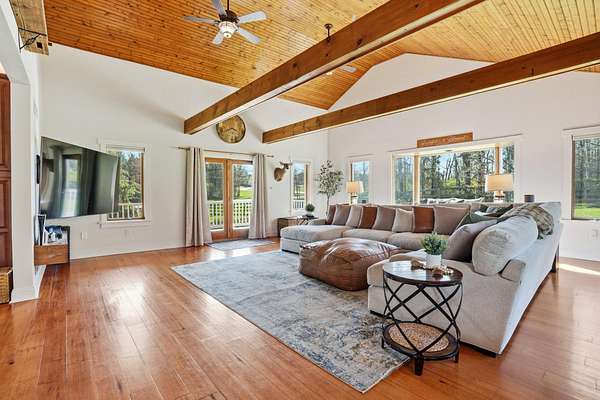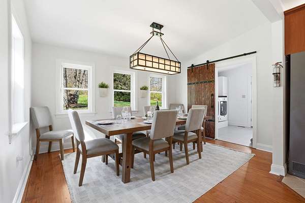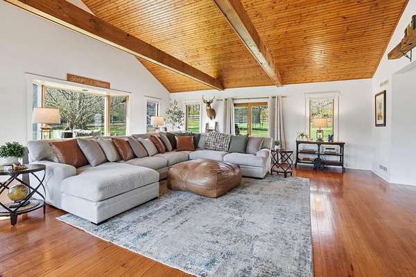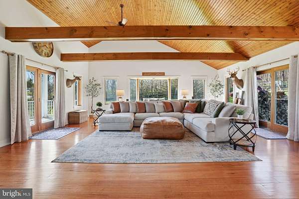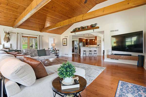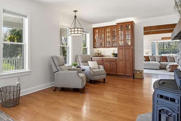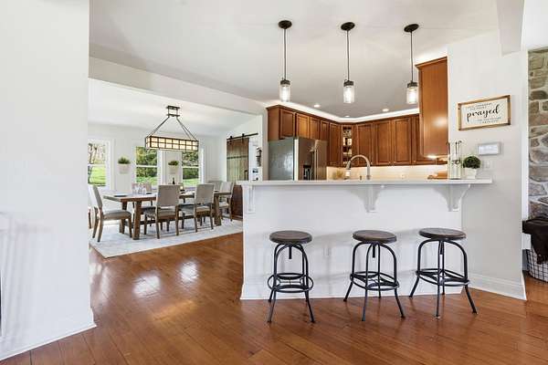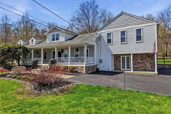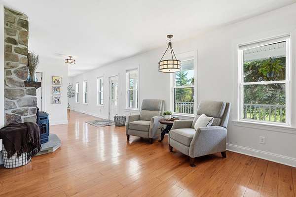 Welcome to this truly special property offering space, style, and serenity in the heart of the Upper Perkiomen Valley. Set on a picturesque, completely fenced-in lot with mature trees and open green space, this beautifully maintained home blends timeless character and flexible living spaces with thoughtful updates throughout. From the moment you arrive, the expansive covered front porch invites you to relax and enjoy the peaceful surroundings. Inside, you're immediately greeted by the stone fireplace with reclaimed wood mantle and wood burning insert. The built-in bar cabinetry and rich hardwood floors lead you into the dramatic great room, which steals the show with it's vaulted ceilings, exposed wood beams, and walls of windows that fill the home with natural light - an ideal setting for both everyday living and memorable gatherings. The updated kitchen is designed for function and flow, featuring wood cabinetry, stainless steel appliances, generous counter space, and a large breakfast bar, opening seamlessly to a bright dining area perfect for hosting family and friends. Behind a custom built sliding barn hides a large, functional laundry room complete with utility sink, rear deck and basement access. The main floor offers a full bathroom and 1 bedroom (rock wall bedroom). Up half a flight of stairs you'll find the Primary suite and the custom built, queen sized loft bed bedroom. The spacious primary en-suite serves as a calming retreat with it's attached full bath, walk- in closet, high ceilings, warm finishes and abundant natural light. The upper level provides versatile bonus space, ideal for a home office, media room, or play area. Outdoor living is just as impressive with a large rear wraparound deck overlooking the expansive fully fenced yard, providing endless opportunities for entertaining, recreation, or simply enjoying the outdoors. Additional highlights include the oversized 3 car garage, extended driveway with ample parking, and beautifully landscaped grounds that enhance the home's privacy and curb appeal. Conveniently located near Green Lane Park, PA routes 29, 73 & 563 as well as nearby Sumneytown, Skippack, and Spring Mount, this iconic property offers the perfect balance of elevated living with quiet surroundings and accessibility. Showings start on 04/23 - set your appointment now! Homes with this setting, layout, and level of care are rarely available. Schedule your private showing today and experience everything 1847 Gravel Pike has to offer.