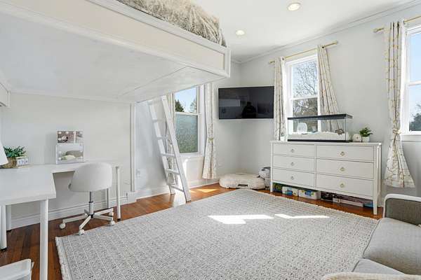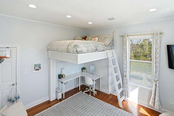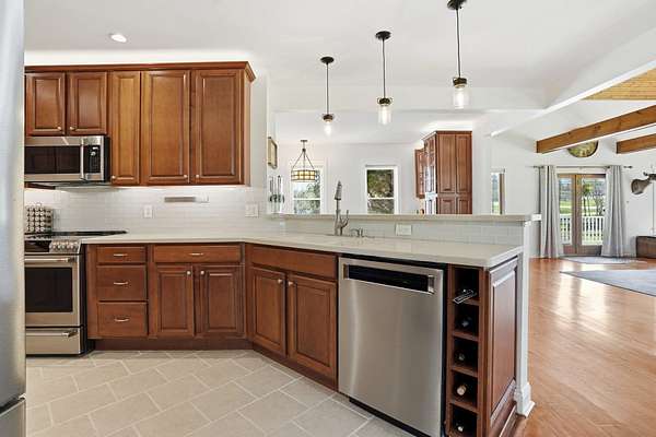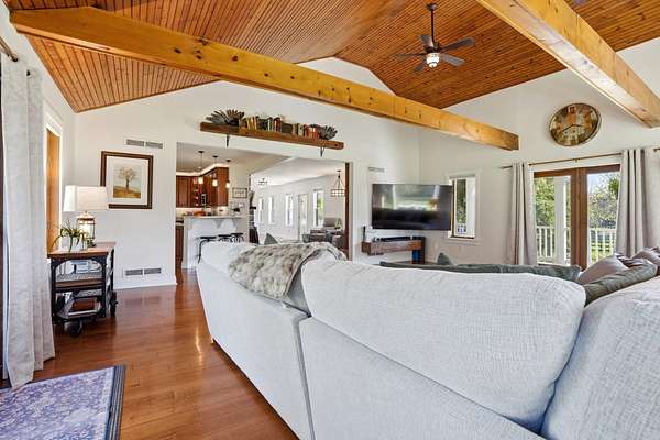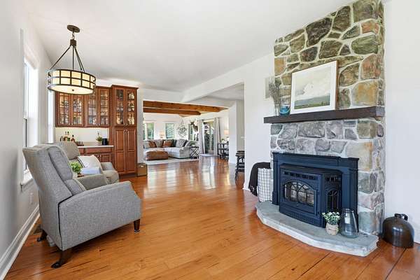 - Attic, Breakfast Area, Built-Ins, Carpet, Ceiling Fan(s), Combination Kitchen/Dining, Combination Kitchen/Living, Dining Area, Entry Level Bedroom, Exposed Beams, Family Room Off Kitchen, Galley Kitchen, Jetted Tub Bathroom, Open Floor Plan, Pellet Stove, Primary Bath(s), Recessed Lighting, Tub Shower Bathroom, Walk-In Closet(s), Wood Floors