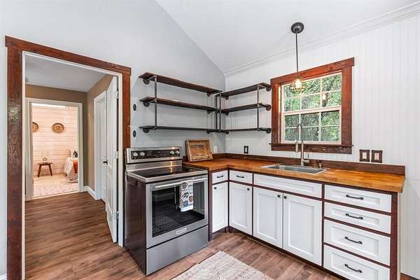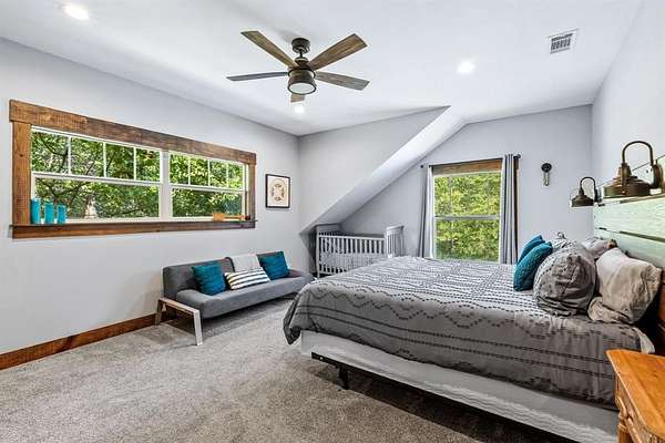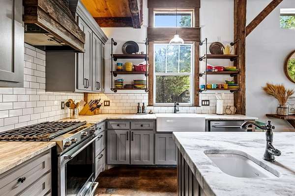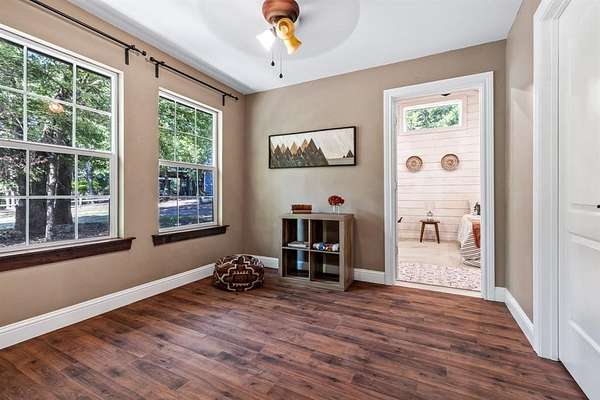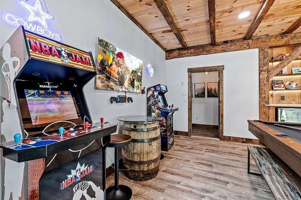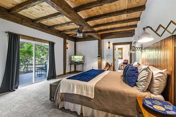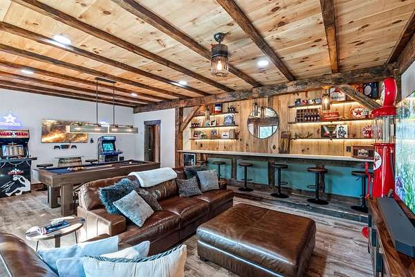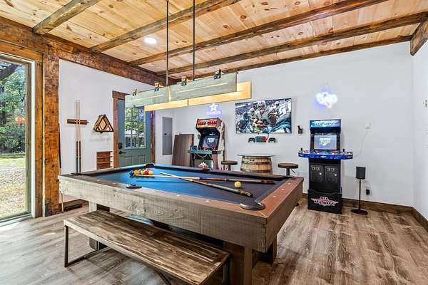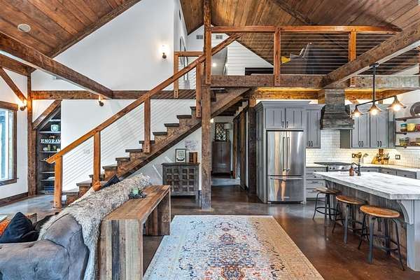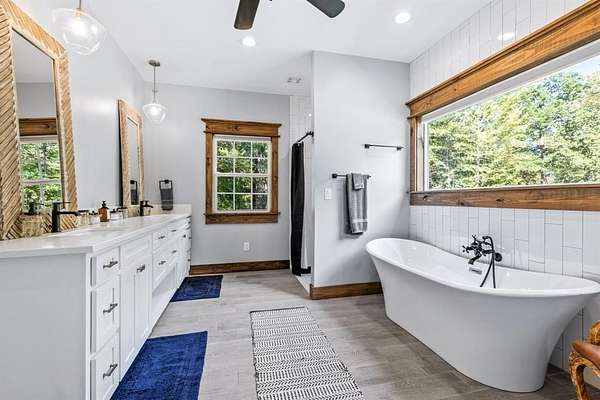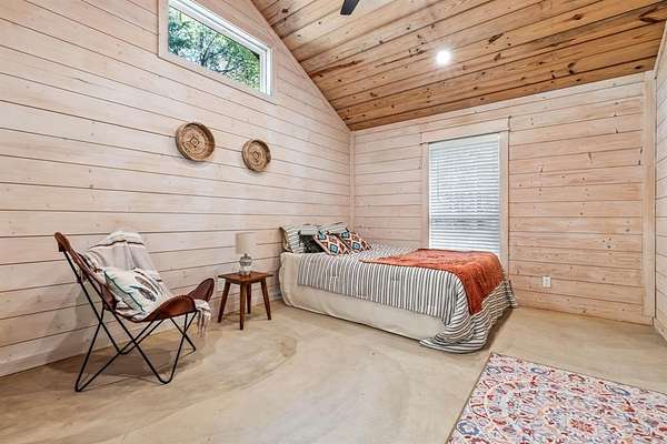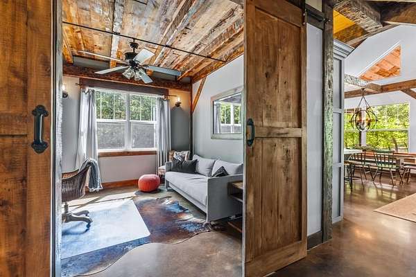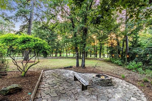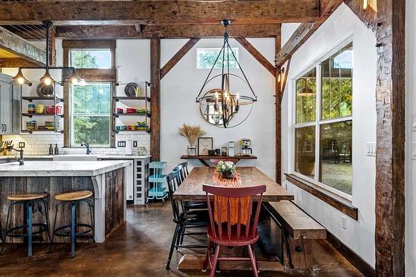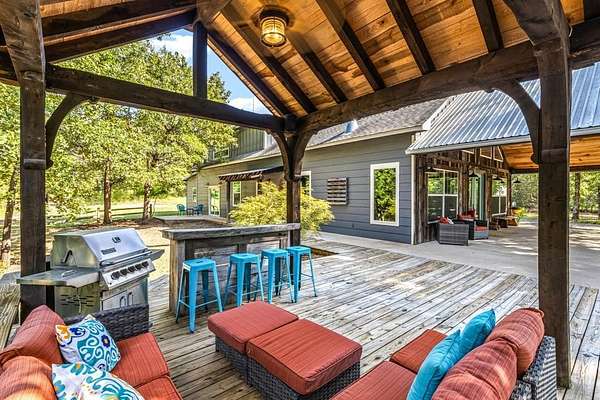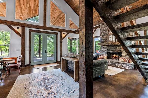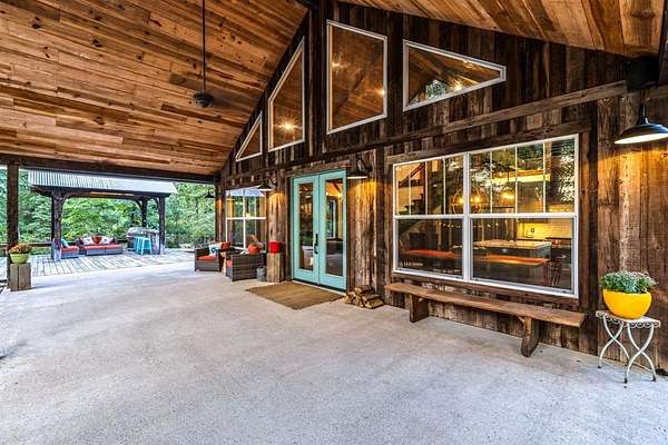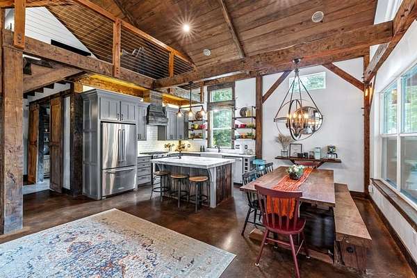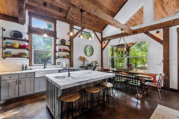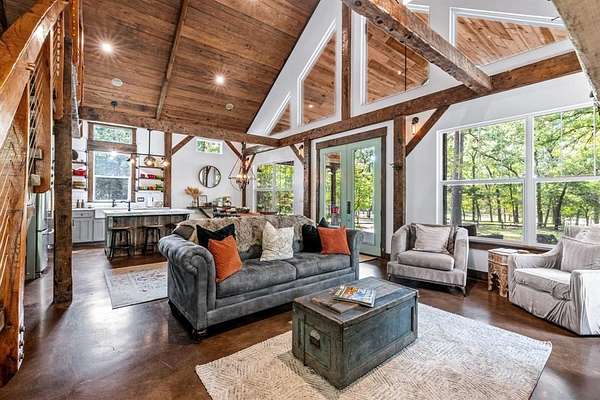 Est $7,503/moStunning industrial farmhouse on 11 wooded acres in Lindale, custom built as the personal residence of luxury builder Evan Tate (E.T. Construction). Showcasing soaring timber framed ceilings, a stone fireplace, and walls of glass with serene views. Chef's kitchen with marble island, farmhouse sink, and SS appliances opens to spacious dining and living areas. Primary suite with spa bath plus loft, guest rooms, office, and game room with full bar. Expansive decks, patios, fire pit, and a 536 sq. ft. guest house with 2 BR, full bath, and kitchen complete this private retreat