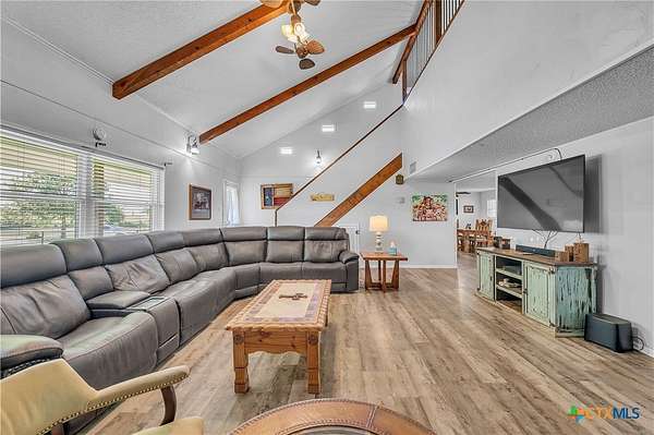 - Beamed Ceilings, Breakfast Area, Breakfast Bar, Ceiling Fans, Eat In Kitchen, Game Room, Granite Counters, High Ceilings, Home Office, In Law Floorplan, Kitchen Family Room Combo, Kitchen Island, Main Level Primary, Multiple Living Areas, Open Floorplan, Primary Downstairs, Separate Shower, Shower Only, Split Bedrooms, Vaulted Ceilings