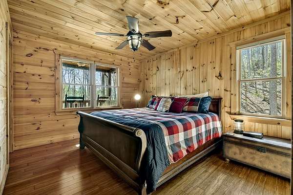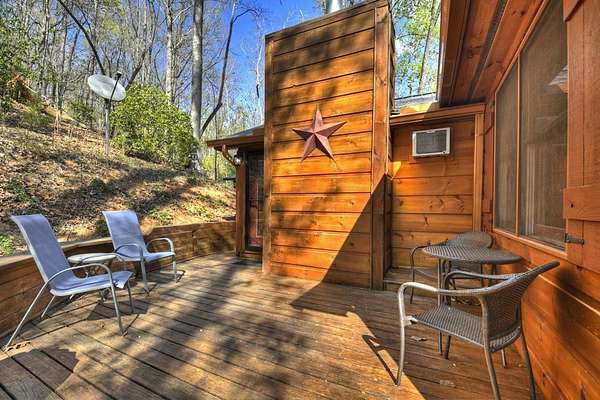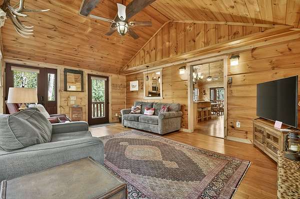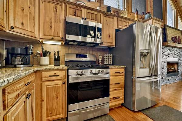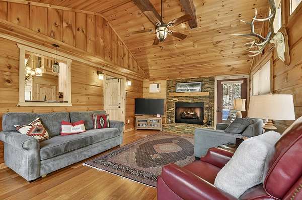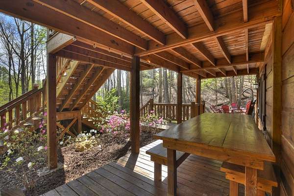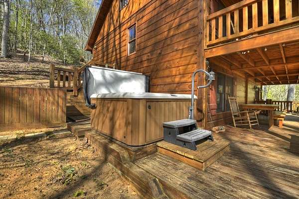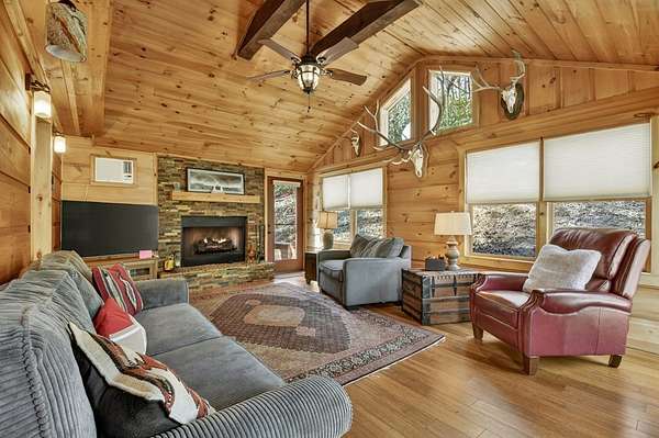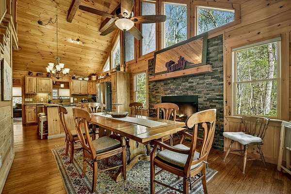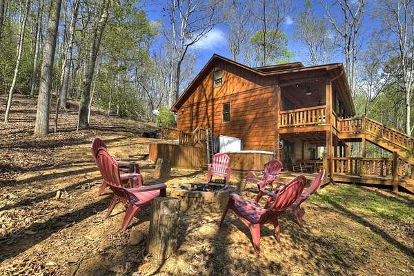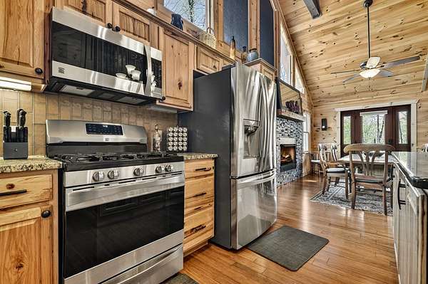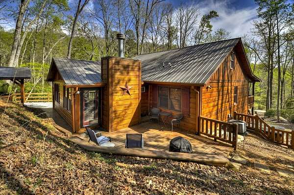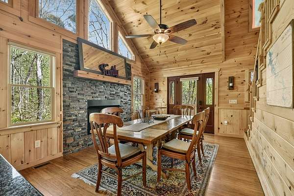 Situated on 1.9 private acres, this furnished mountain home balances comfort and character in a scenic setting. Enjoy seasonal mountain views that enhance the tranquil atmosphere year-round. The home features inviting details such as hickory cabinetry, granite countertops, and a modern tile backsplash. The main level includes two bedrooms and two full bathrooms with ceramic tile floors, tiled showers, and a double vanity for added comfort. On the main floor, a spacious living room with a fireplace and an open dining area—also featuring a fireplace-sits adjacent to the kitchen, making it an ideal space for gatherings. Upstairs, a roomy loft bedroom offers extra sleeping accommodations and character. The lower level provides additional space to unwind, including a bonus bedroom, a game room, and another living area—well-suited for guests or multi-generational households. Step outside and take in the fresh mountain air from covered porches or gather around the fire pit under the stars. The soothing sound of the nearby creek sets the scene for relaxation, including a hot tub ready for you. There is plenty of parking and a convenient carport. Conveniently situated between Blue Ridge and Blairsville, this private property offers a balance of privacy and accessibility. It works well as a full-time home, vacation spot, or potential rental property.
