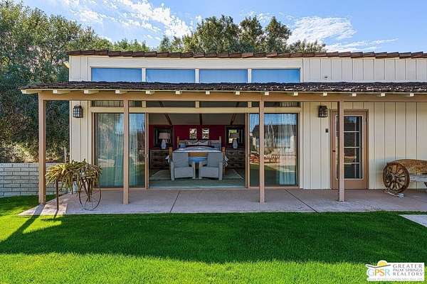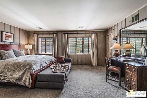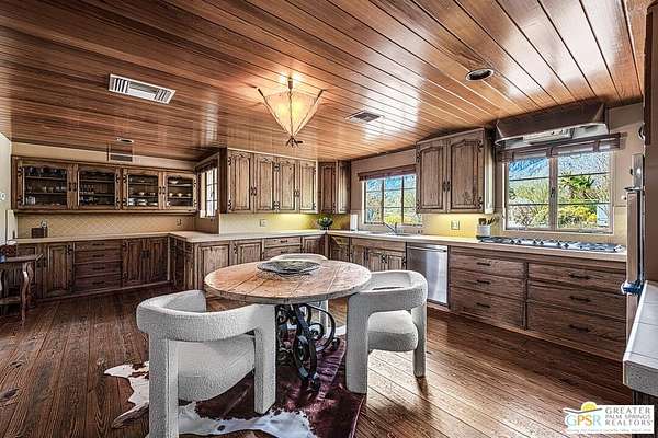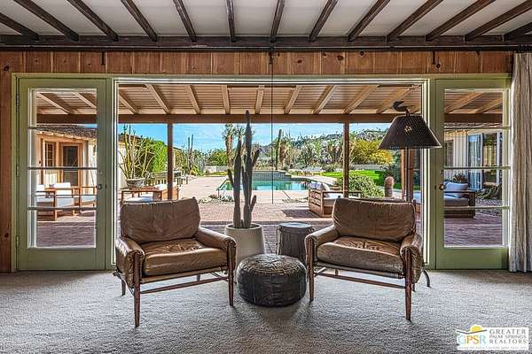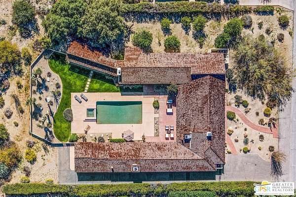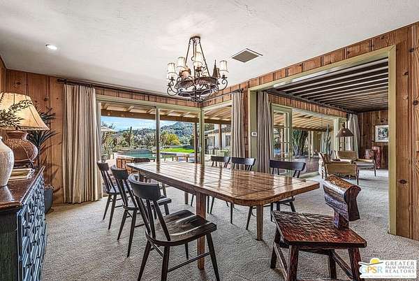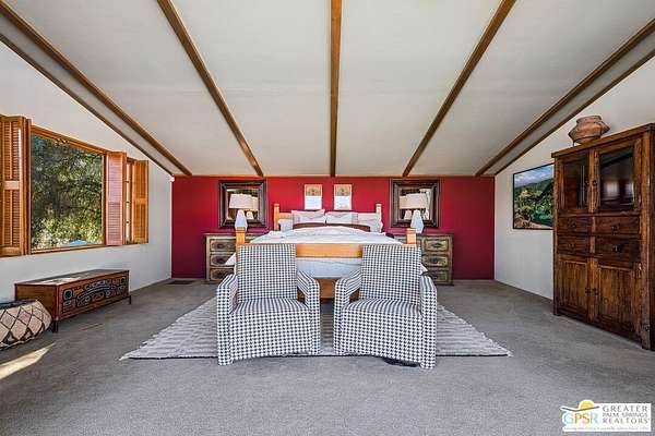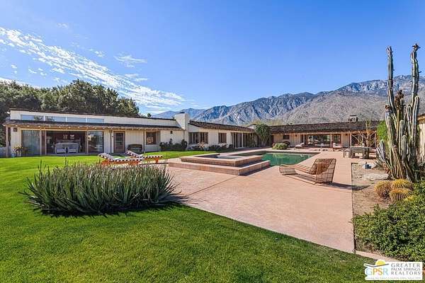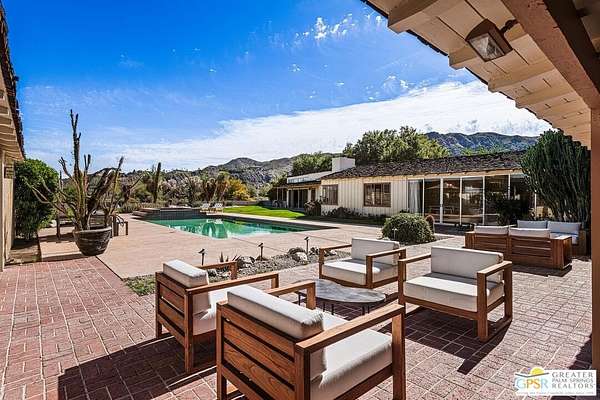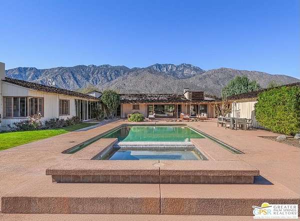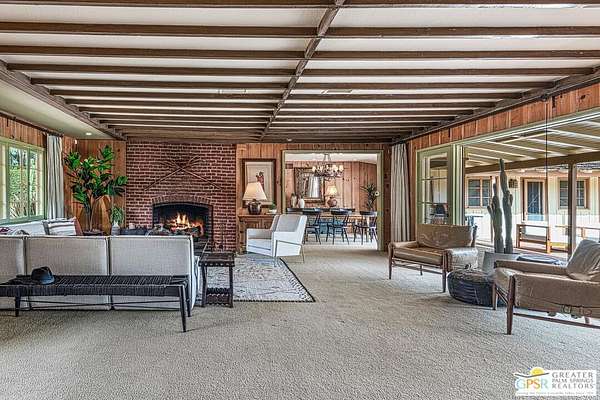 Step back in time at the Blankenhorn-Gilmore Residence, the foundational private estate of Smoke Tree Ranch and a unanimously designated Class 1 Historic Resource. Built in 1930 by master architect Garrett Van Pelt Jr. and sensitively expanded by the iconic Albert Frey, this 5-bedroom, 7-bathroom sanctuary served as the architectural blueprint for the entire enclave. Set on 1.88 deeded acres across three lots plus an exclusive view lot, the 5,504-square-foot home perfectly captures the "Romance of the Old West" with its signature Ranch-style horizontality and board-and-batten exterior. The interiors are a masterclass in rustic sophistication, featuring dramatic exposed-beam ceilings, natural wood-paneled walls, and a massive floor-to-ceiling red brick fireplace. Wooden casement windows frame unobstructed, panoramic mountain views and lead to a private backyard oasis complete with a rectangular pool and integrated spa. This is a rare opportunity to steward a piece of Palm Springs history once owned by the Ranch's principal developer, L. Mac Blankenhorn, offering a level of pedigree and privacy that is simply unmatched.