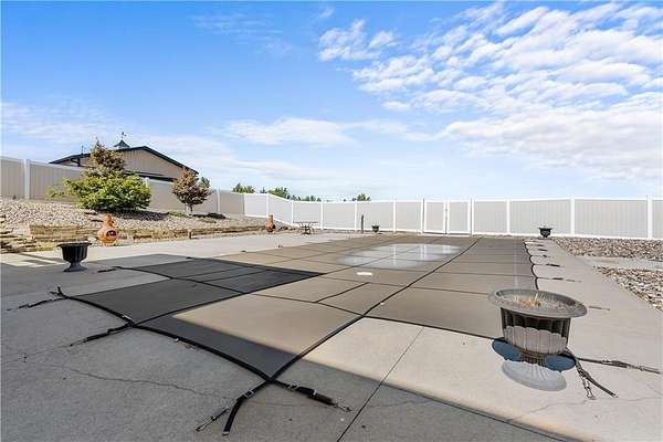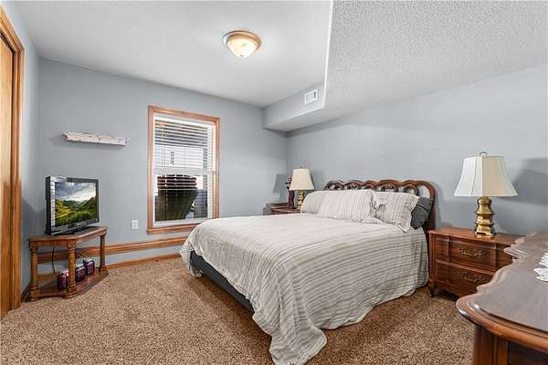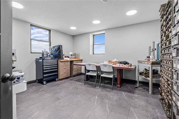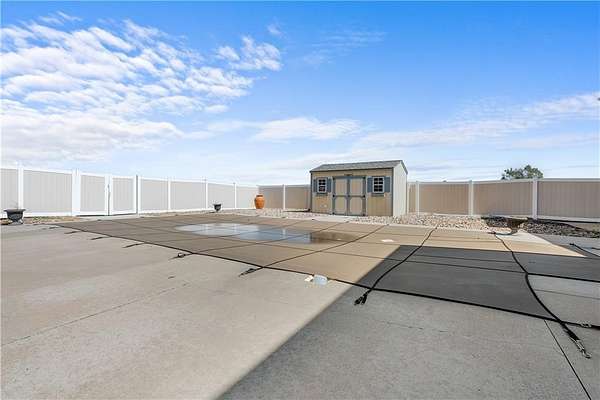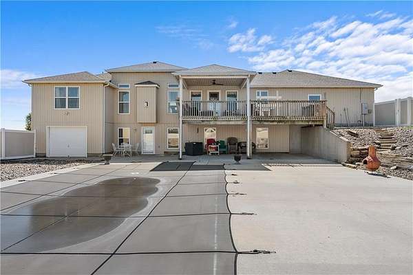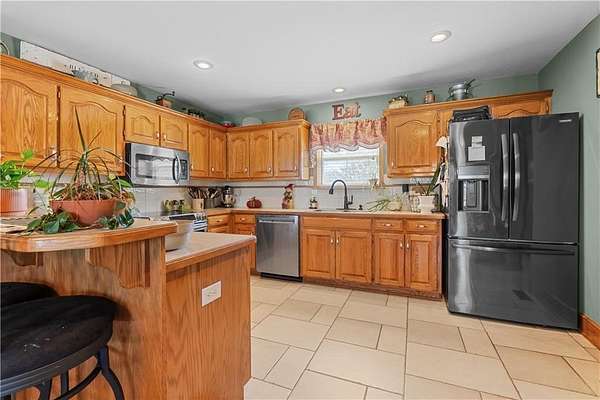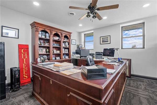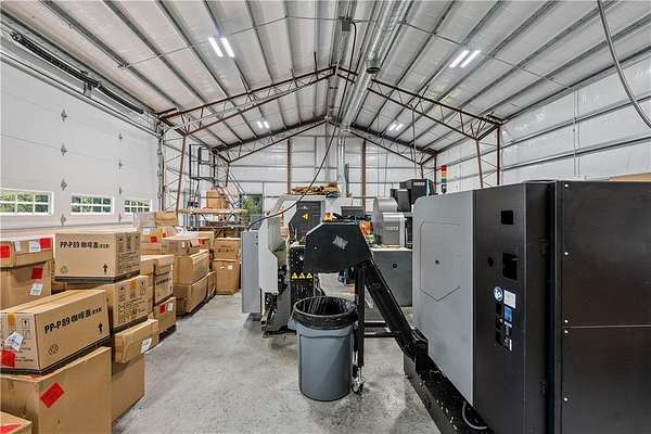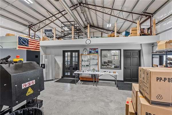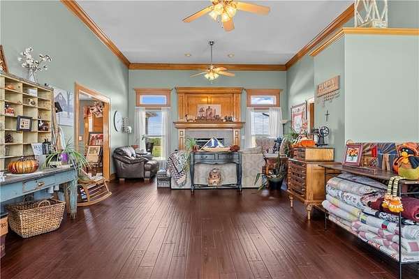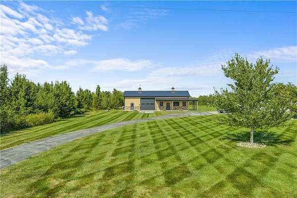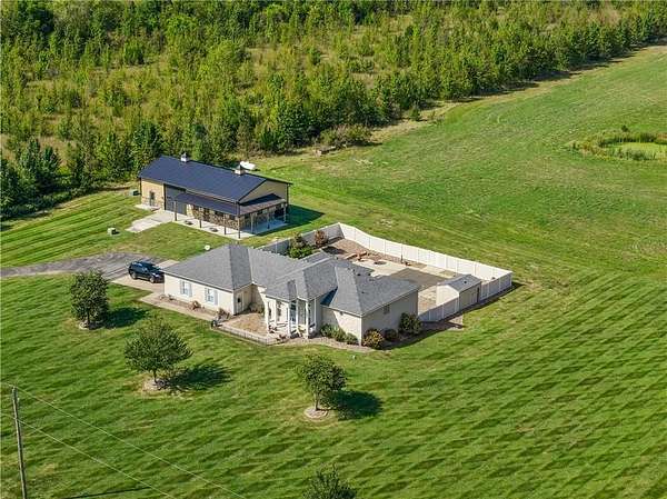 WOW - the whole package: house, acreage, inground pool, outbuilding, stocked pond and incredible taxes. This rare property makes the dream a reality. Step inside to a dramatic great room with 12-ft ceilings, crown molding, ceiling fans, a cozy fireplace and gleaming hardwoods. The bright, roomy kitchen and dining area offer abundant counter space, pantry and ceramic floors, flowing easily to the 3-car side-entry garage, laundry and powder room. A comfortable den provides a peaceful retreat. The main-level owner's suite is a private oasis with hardwood floors, tray ceiling, ceiling fan and an en-suite bath featuring a jetted tub, separate shower, double vanity and a generous walk-in closet. The lower level, with newer carpet, adds living space for entertaining, two sizable bedrooms, a full bath, a fourth garage bay and extra storage - plus walkout access directly to the inground pool. Outdoor living shines: an extended covered deck overlooks a 19x30 sport pool (3.5 ft at both ends, 6.5 ft center) and sunsets over 9.7 acres. Explore roughly 1.5-acre, 15-ft-deep stocked pond with bass and catfish - perfect for fishing, wildlife and relaxation. The 1,800 sq ft outbuilding is all steel, fully insulated with stone cladding and a wrap-around porch, plus a 450 sq ft loft, two offices and a half bath. It has its own electrical service and transformer, and is heated & cooled - ideal for a business, workshop or multi-use space. Notable updates & extras: roof and HVAC ~3 years new, two 50-gallon water heaters, mini-split in the 3-car garage, stair lift (can remain or be removed). Use this property for multigenerational living, a home business, mini-farm or homesteading. Bring your dreams to life - call today or have your REALTOR schedule a showing.