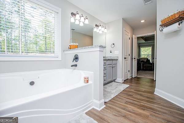 - Double Vanity, Separate Shower, Soaking Tub, Tile Bath, Tray Ceiling(s), Walk-In Closet(s)