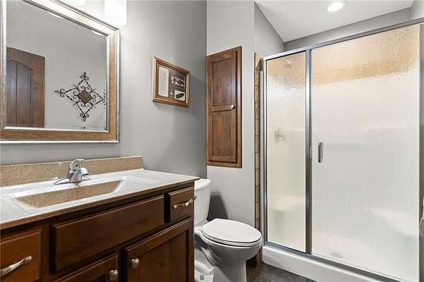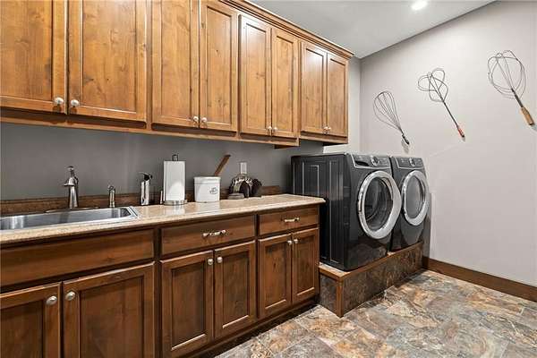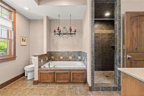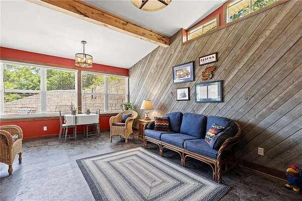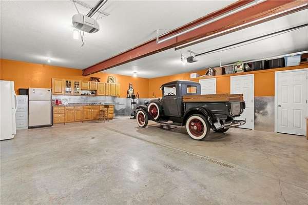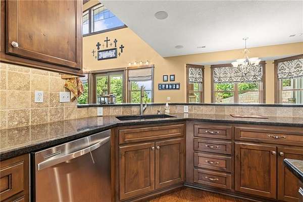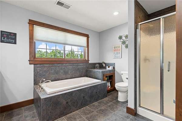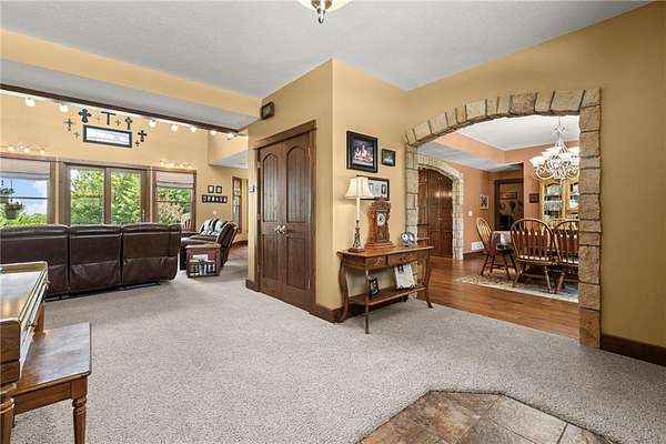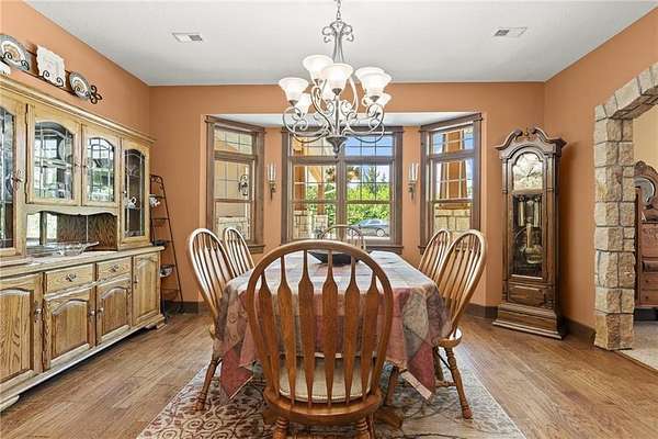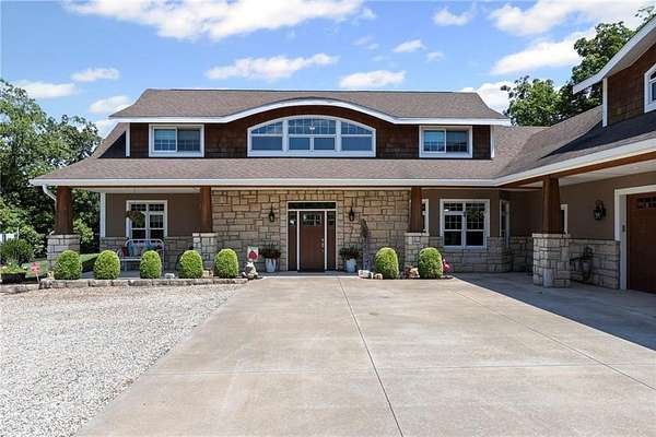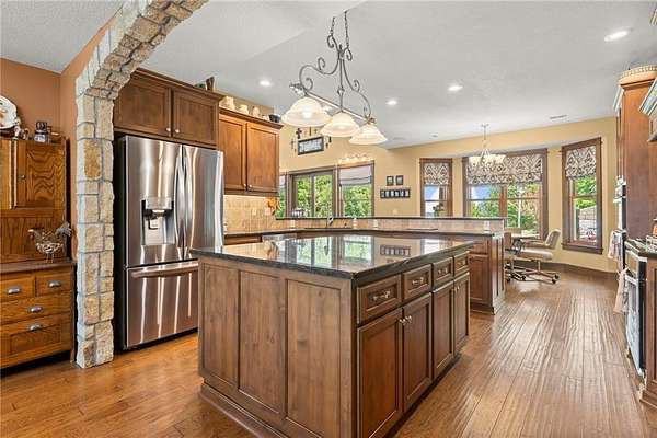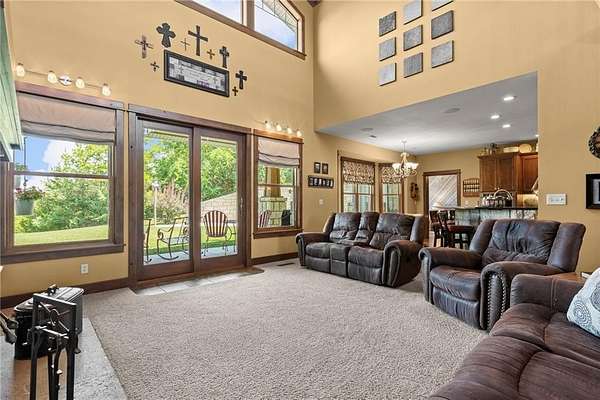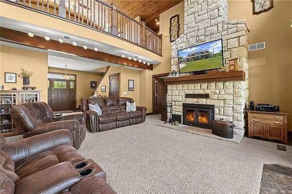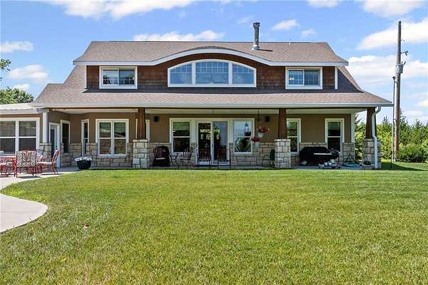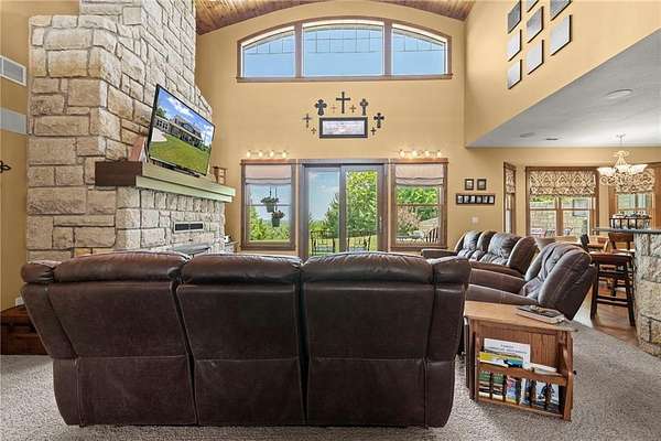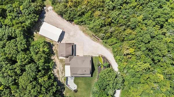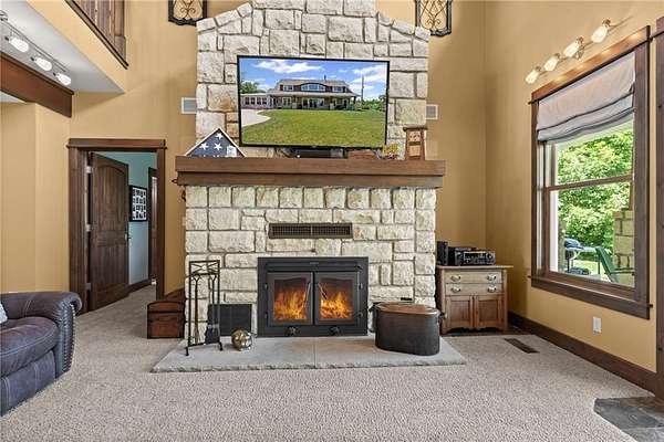 Stunning 1.5 story 4-bedroom 3 bath nestled atop the highest point of 25+ breathtaking wooded acres in Tonganoxie, Kansas. This home combines modern custom design with high-end finishes throughout. Soaring tongue and groove vaulted ceiling with Knotty Pine Hand Scraped finish and architectural details throughout creating a sense of warmth and style. Sunlight pours into the expansive great room through a wall of windows, offering picturesque views. This home has a landscaped terrain located on the south side connecting with an exterior wall. The main level includes a 15x10 open concept grand foyer entryway, formal dining room, a gourmet kitchen equipped with a gas cooktop, built-in double oven and microwave, walk-in pantry, granite countertops and island. A sunlit eat-in kitchen with access to sunroom and patio. A bonus room which can be used as an office or non-conforming bedroom. The kitchen and dining room open to a great room with a floor to ceiling natural stone wood insert fireplace. The main-level primary master offers a spa-like en-suite featuring a double vanity, tiled walk-in shower, and whirlpool tub. Upstairs, on the main north wing you'll find a 17x17 family room loft with panoramic views of the city's skyline. Three 9 ft. ceiling bedrooms with walk-in closets, and a hallway bathroom with walk-in shower and separate jetted tub. You will be captivated with 2 unique living areas, a north wing, the primary living area and a separate south wing featuring a 31x25 rec room over the garage. With a second access mudroom hallway entrance that includes a laundry room full bathroom. Property features include a 30x48 shop with electricity, a concrete floor, and 12 ft. garage door. Additional features include a zoned geothermal system supplied by 3 wells, concrete storm shelter, and electric service that has an existing exterior disconnect to add a generator. Situated close to I-70, K-10, and 24-40 with convenient access to Leavenworth, Lawrence, Kansas City.