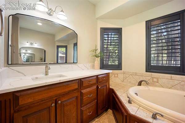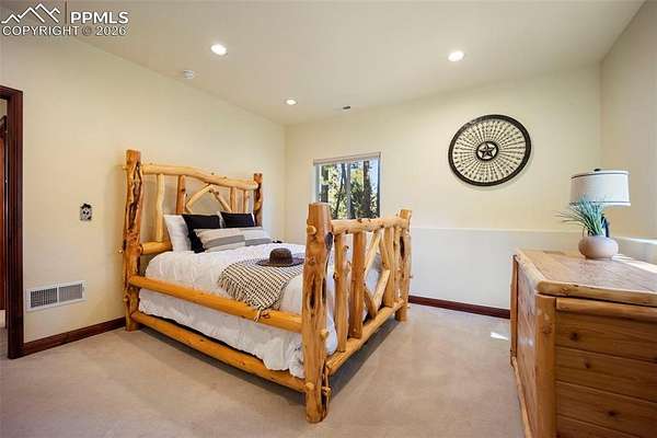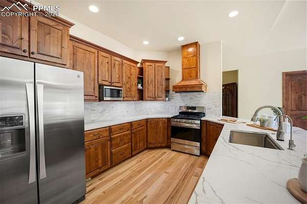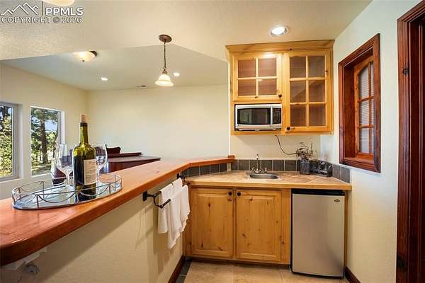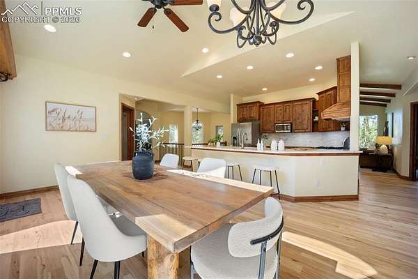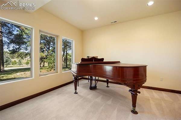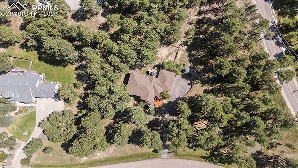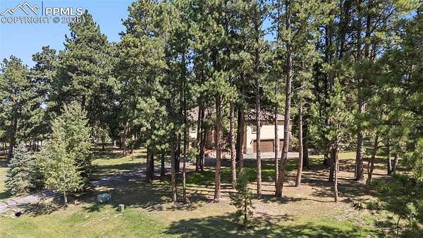 Welcome to this stunning custom home, nestled on 2.5 private, treed acres in the highly sought-after Kings Deer community. With over 4,700 square feet of beautifully crafted living space, this residence offers the perfect blend of Colorado rustic charm and modern luxury. Step into the inviting living room, where soaring wood-beamed ceilings, expansive windows that fill the space with natural light, and a stone-surround fireplace frame create the perfect living area. The gourmet kitchen is a chef's dream, featuring knotty alder cabinetry, expansive quartz countertops, a custom vent hood, stainless steel appliances, and rich hickory hardwood floors-perfectly designed for both everyday living and entertaining. The primary suite is a private retreat with a bay window, double closet, and spa-like five-piece bath complete with dual vanities, a jetted tub, and large custom-tiled shower with glass door. A secondary main-level suite with a sitting room, private bath, double closet, and its own exit to the back deck provides ideal accommodations for guests or multi-generational living. A main-level office with an entire wall of custom built-ins adds both function and sophistication. Downstairs, the full walk-out lower level is made for entertaining. Enjoy a dedicated theater room with built-ins, surround sound, screen, projector, and wet bar. A custom wine cellar, spacious family room with stone-surround fireplace, and game area complete this versatile space. Two additional bedrooms and full bath. Throughout the home, knotty alder doors and trim create a luxurious Colorado feel. Outdoor living is just as impressive with a 20x20 composite deck and serene forested setting. Additional highlights include a three-car attached garage, newer roof, new well pump, and a low-maintenance stacked stone and stucco exterior. Located just minutes from Monument, I-25, and Highway 83, this home offers a peaceful retreat with an easy commute to both Colorado Springs and Denver.