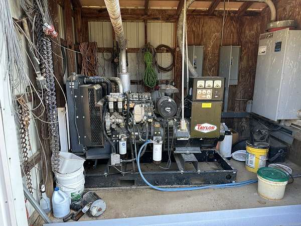 Farm infrastructure includes composting for mortality, a litter barn, and a diesel generator for backup power. The poultry houses feature Cumberland nests, Cumberland chain hen feeders, Lubing drinkers, plastic strip slats, and steel truss construction. The farm is supplied by well water.