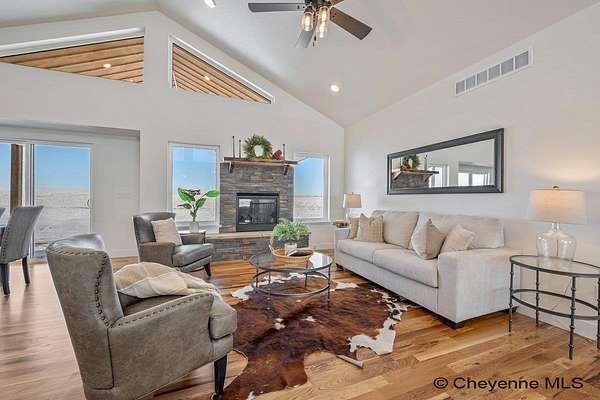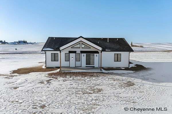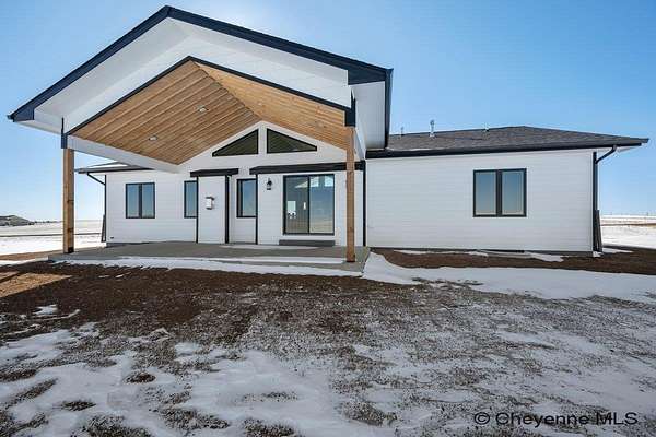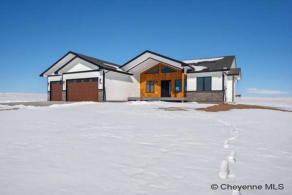 Experience refined rural living in The Alpine by Triple Dot Homes - an exceptional custom home nestled on 5.25 scenic acres. With over 3,500 square feet of thoughtfully designed space, this home blends rustic charm with modern luxury. High-end finishes include rich hardwood flooring, granite countertops, a striking stone fireplace with a live-edge mantel, and solid alder doors. Unique craftsmanship shines through with custom blacksmith handrails and energy-efficient vinyl casement windows. Designed for comfort and sustainability, this home features central A/C, a high efficiency furnace, and a fully insulated and drywalled garage with a heater rough-in. Step outside to a spacious covered back patio - perfect for entertaining or soaking in Wyoming's breathtaking sunrises and sunsets.