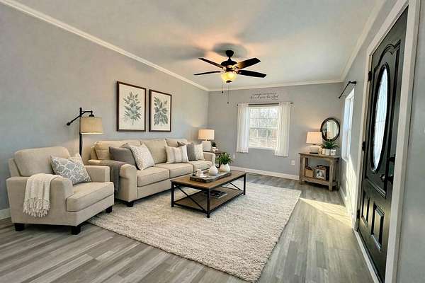 This amazing home sits on 2.51 acres in a peaceful country setting. Designed for comfort and functionality, the home features an open floor plan with a spacious living room that flows seamlessly into the expansive kitchen. The kitchen is loaded with upgrades, including soft-close drawers, abundant cabinetry, extra-large pot drawers, a dedicated pan cabinet, pull-out trash cabinet, lazy Susan, touchless faucet, and a massive 9.25' x 3.25' eat-at island--perfect for gathering and entertaining. The primary bedroom offers a comfortable retreat with a private ensuite bath, while two additional bedrooms, a guest bathroom, and a convenient laundry area complete the interior. Step outside to enjoy the sprawling yard with 2.51 acres of level to gently rolling land, offering endless possibilities for outdoor living, gardening, or recreation. This home is truly a must-see. (some pictures are virtually staged).