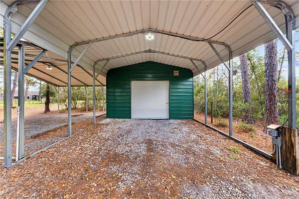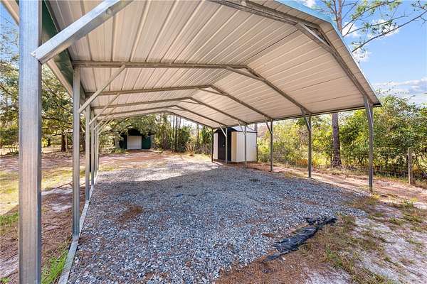 This property also offers exceptional storage and workspace with multiple outbuildings, including a 24x24 free-standing garage with workbenches and attic fan, a 20x18 enclosed steel barn with covered porch, a 450 sq ft double carport, and an additional steel pole barn. All outbuildings are equipped with water and power, and the property is secured by a 16' solar-powered farm gate. The home is equipped with in-wall pest control tubes (Pest Tubes), an interior treatment system installed during construction that can be serviced by most local pest control companies.