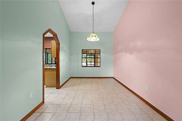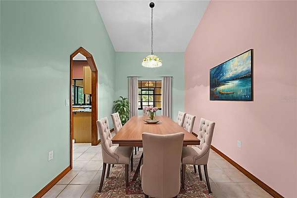 Step inside to a spacious living room with a bay window, flowing into the dining room with views of the backyard. The kitchen offers a vaulted ceiling, breakfast bar with stools, large sliding pass-through window to the lanai, granite countertops, wood cabinets with wine glass holders, magnetic utensil rack, and an LG refrigerator with French doors, double drawers, and Kraft ice maker. A closet pantry provides ample storage. The family room features tile floors and large sliders that open to the backyard.