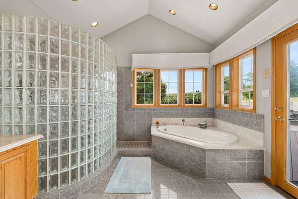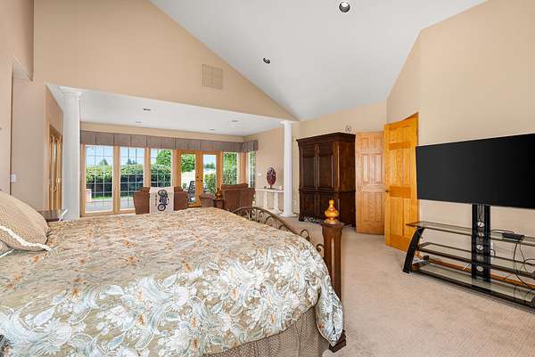 From the moment you enter, soaring vaulted ceilings and a dramatic dual-fuel fireplace set the tone for a residence designed to impress. The main floor is thoughtfully arranged with four spacious bedrooms, each featuring its own ensuite bathroom, an executive office, and formal dining with a butler's pantry. The living room, complete with a custom wet bar, creates an ideal space for entertaining or unwinding with family. The primary suite is a true retreat, offering his-and-hers closets, a spa-like bath, and pasture views framed by electric blackout curtains.