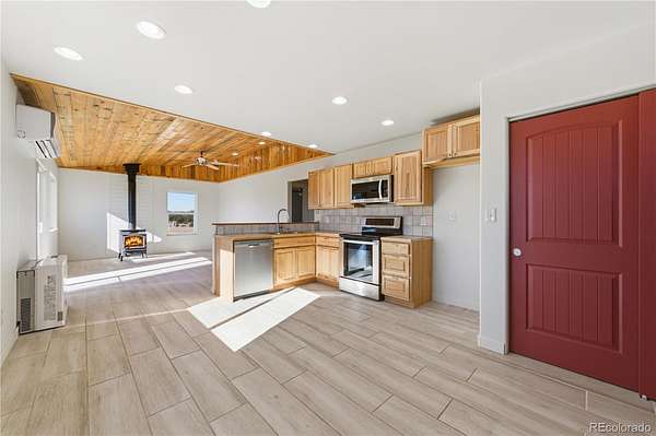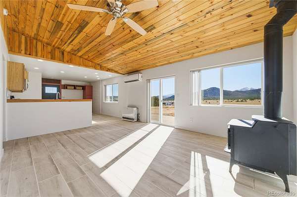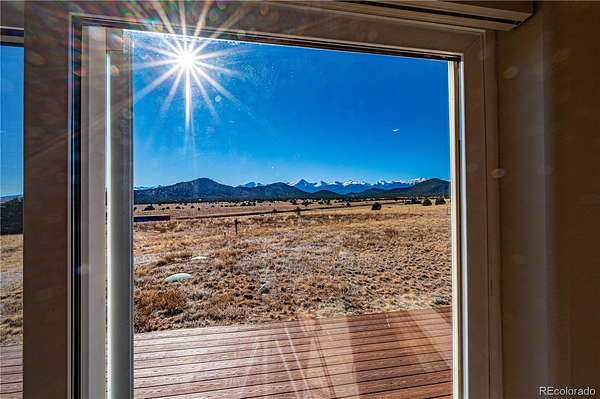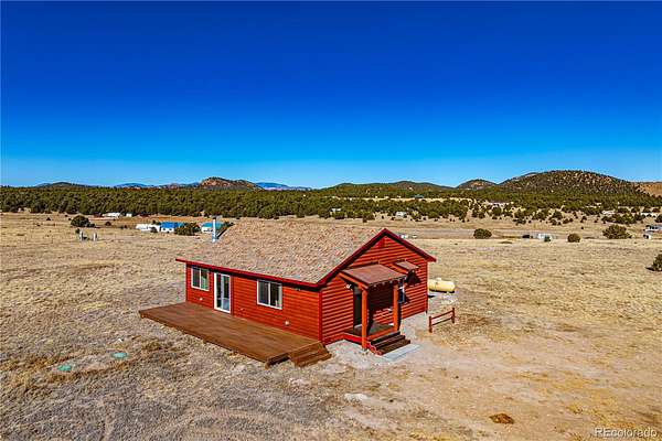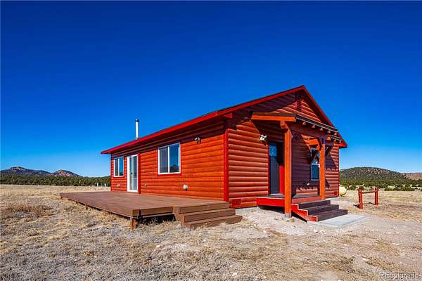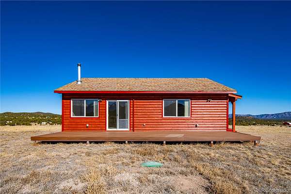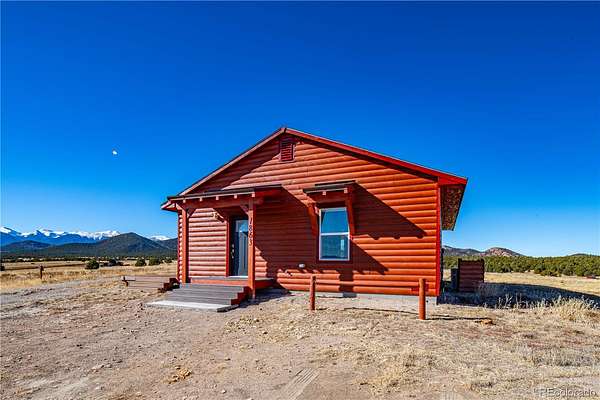 HUGE Sangre de Cristo range views. Set on 2.54 acres in the wide-open landscape of Florida-Colorado Acres, this 2018-built log-style home offers space, HUGE views, and flexibility with no HOA and no covenants. The 1,008 sq ft single-level layout features 2 bedrooms and 2 full baths, designed for easy living and low maintenance. The interior has been freshly painted, enhancing the bright, open feel created by vaulted ceilings and abundant natural light. Ceramic tile floors, a wood-burning stove, and a functional eat-in kitchen with tile countertops and modern appliances complete the main living space. Both bedrooms are generously sized, and the primary bath includes a double vanity and walk-in shower. Recent upgrades include new shower doors, new carpet, new blinds, new propane heating system and fresh exterior stain, adding comfort, efficiency, and long-term durability. Step outside onto the composite deck and take in 360-degree mountain views across the surrounding meadow. The level 2.54-acre parcel is ideal for horses, RV parking, or future outbuildings, with a household well, septic system, electricity, and propane already installed. Located in rural Cotopaxi, this property offers a quiet setting with easy access to outdoor recreation, dark skies, and Colorado’s high-country lifestyle. Whether you’re seeking a full-time residence, weekend retreat, or investment opportunity, this property delivers space, views, and freedom rarely found at this price point.