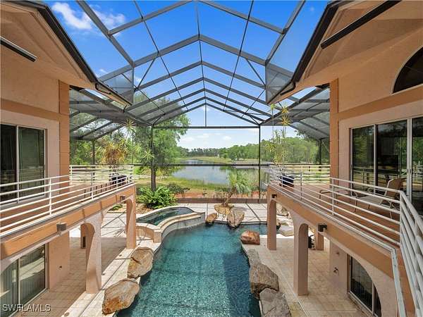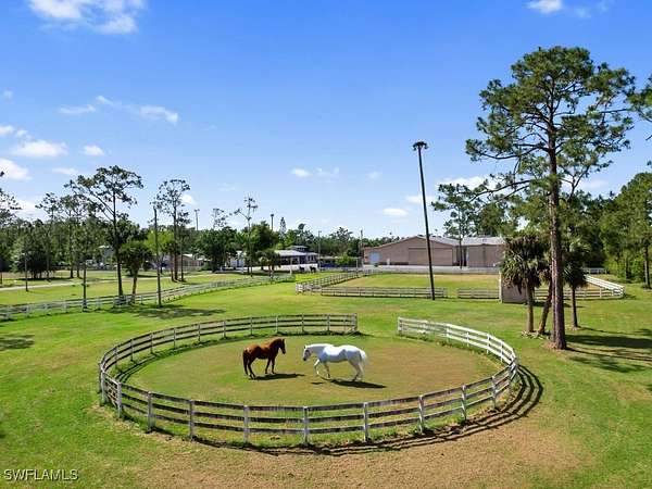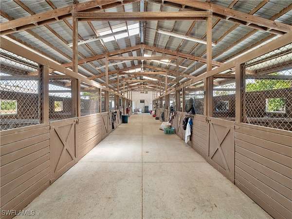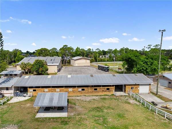 One-of-a-Kind 30-Acre Ranch with Private Runway, Equestrian Facilities & Resort-Style Living. Discover the ultimate blend of privacy, space, and adventure on nearly 30 acres just minutes from Historic Downtown Fort Myers. This extraordinary estate is a rare opportunity, offering a lifestyle few can imagine, with a private runway, expansive equestrian amenities, and a luxurious 8,000+ sq ft home. The main residence is thoughtfully designed for both everyday living and grand entertaining. With six spacious bedrooms, including a private mother-in-law suite, an elevator, and an open-concept kitchen and great room, it provides comfort and convenience at every turn. Step outside to your own private oasis: a resort-style pool and spa set within a two-story screened courtyard surrounded by natural stone, covered patios, and sweeping ranch views. Pilots will appreciate the property's private airstrip, providing direct access for aircraft and a seamless fly-in, fly-out lifestyle. Car enthusiasts and hobbyists will find endless flexibility with three large storage buildings, including one 100-foot structure with six bays and an apartment, another with four bays, and a third 89-foot building with six more bays, perfect for RVs, planes, helicopters, car collections, or equipment. Equestrians will find everything they need: a 15-stall horse barn with a loft, attached one-bedroom unit and workshop, two riding arenas, and a round pen. The land is fully cleared, fenced, and impeccably maintained, ideal for trail riding or simply enjoying peaceful country living. As an added bonus, this offering includes a residential lot in the exclusive Pine Shadows Air Park, one of Southwest Florida's premier aviation communities. Whether your passion is flying, riding, or simply living large with room to roam, this unique ranch delivers it all. A true sanctuary of freedom, functionality, and luxury.