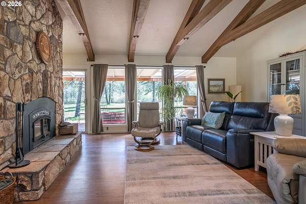 This exceptional property offers a rare combination of beauty, tranquility, and refined living. Set on a gentle sloped 12.89 acres of land and that is located at the end of a private road. The grounds are thoughtfully designed with exquisite landscaping, featuring lush garden beds with automatic drip system. The mature trees add a park like setting outdoor among spaces that invite relaxation and enjoyment. Two barns are included, one is a tack/feed barn and the second one is a hay barn. There is a spring fed pond at the back of the pasture that can be used to water livestock and a seasonal creek. At the heart of the property sits an immaculate 4 bedroom, 2 bathroom home. Newly tiled showers in both bathrooms. The kitchen offers stainless steel appliances, double ovens, huge quartz island, custom cabinetry, hot water faucet with a french country feel. The sweeping views sitting on the back covered porch creates a true sense of peace and privacy. Attached to the house is a 2-car carport with plenty of storage. This leads into a laundry room, storage and pantry. This property is a "must-see" won't last long, schedule your showing today!