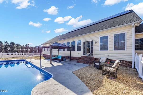Imagine a perfect 75 degree sunny afternoon, relaxing beside your gorgeous in ground pool, surrounded by 1.6 acres of private, peaceful space with no HOA and no City taxes. The water sparkles, the breeze is light, and home is just steps away. Walk inside through the beautiful tiled sunroom, the perfect drop zone for wet towels, and head straight into your main level primary suite to unwind and change. The primary suite is a true sanctuary, featuring a fully renovated bath with a spacious walk in tile shower complete with a large niche for all your essentials and a luxurious jetted soaking tub. Attached to the primary is a versatile flex space ideal for a home office, gym, nursery, or quiet sitting room. Also on the main floor, you will find two additional bedrooms, offering comfort and convenience for family or guests. The brand new kitchen is a showstopper, finished in timeless colors with beautiful quartz countertops and a perfectly placed island where you can sit, sip your morning coffee, and take in the view through walls of gorgeous windows. Upstairs, you will find an additional flex space perfect for a private office or creative studio, along with a large bonus room featuring a recently added full bathroom, ideal for guests or multi generational living. And let's talk about storage or future living space. With over 900 square feet of walk in attic space, the possibilities are endless! The home also offers a three car attached garage with the perfect area for a workshop, hobbies, or extra storage. Recently added Tesla solar panels provide energy efficiency and peace of mind, so when the next ice storm hits or the power goes out, you will never be left in the dark. To top it all off, the home comes with a home warranty that includes added pool coverage, offering even more confidence and protection for its next owner. Be sure to ask about the lender incentive being offered, adding even more value to this incredible opportunity. This is more than a home. It is your private retreat with room to grow, entertain, and truly live.