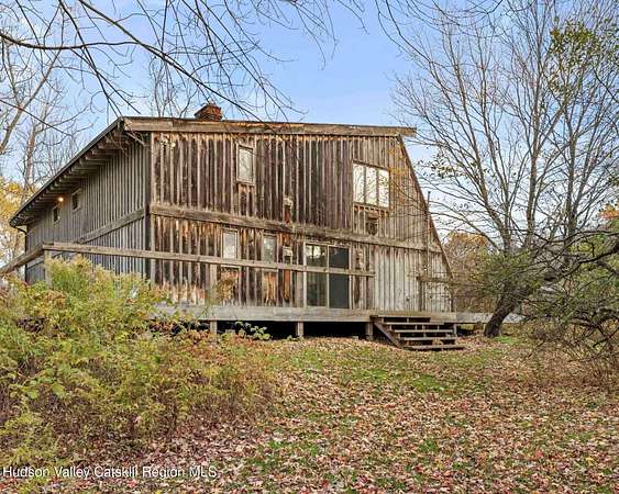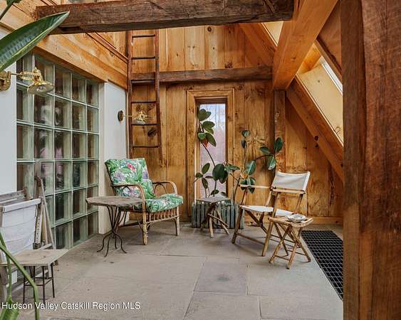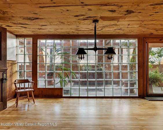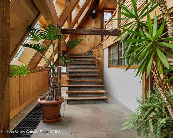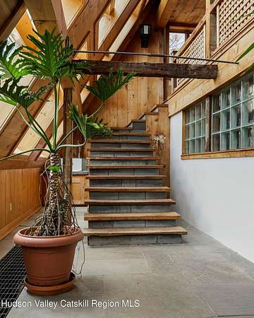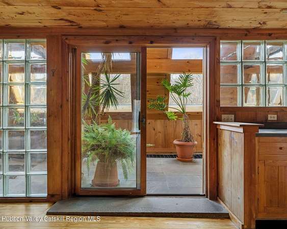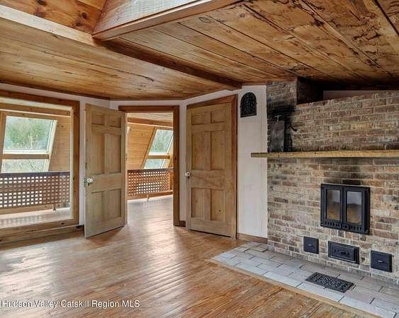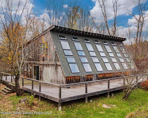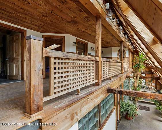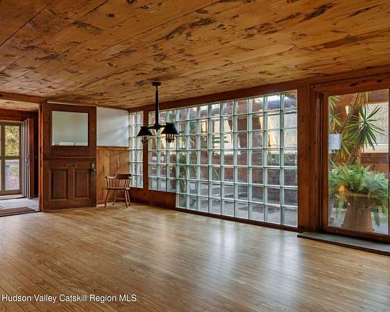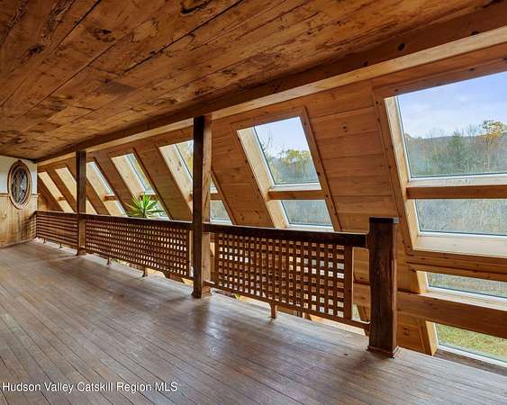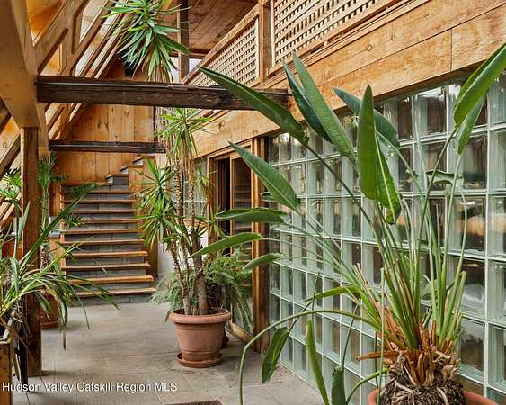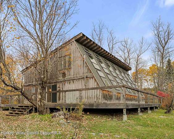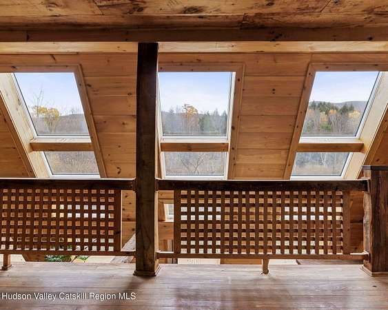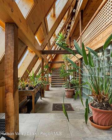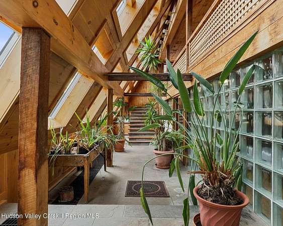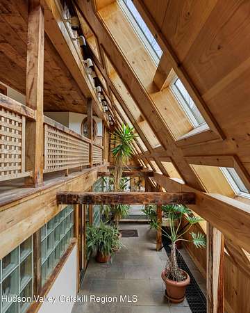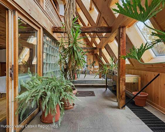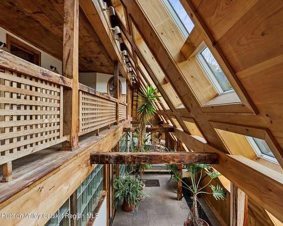 One-of-a-Kind Passive Solar Home on 25 Private Acres Set amid the scenic majesty of the Catskill Mountains, this extraordinary passive solar custom home was born from a Manhattan couple's late-1980s dream - a vision that blended the charm of old-world craftsmanship with the intelligence of nature's design. Built using ''envelope'' construction techniques to capture and circulate the earth's natural warmth and cooling, this residence stands as a true architectural conversation piece, that was featured in Country Living magazine. A double row of south-facing skylights frames sweeping mountain views and captures abundant winter sunlight, while deep roof overhangs provide shade from the high summer sun. At the heart of the structure stands a stunning Finnish-style bluestone fireplace - both centerpiece and natural radiator - absorbing and radiating warmth throughout the home. A second-floor bedroom fireplace adds yet another cozy heat source. Glass brick walls between the main living area and the soaring two-story solarium allow light to flow freely, nurturing a lush indoor greenhouse filled with mature plants and trees. Many of the home's doors are over 100 years old - thick, hand-crafted Dutch doors lovingly sourced from antique auctions to evoke timeless farmhouse charm. The Shaker-inspired kitchen cabinetry completes the home's warm, artisanal aesthetic. Upstairs, the open loft overlooks the sunlit atrium below, creating a tranquil connection between the living spaces. The home's brand-new 35-year architectural roof (installed Fall 2025) ensures lasting protection for decades to come, complemented by a whole-house back up generator in case of power outages. Set on 25 private acres, the property includes a detached garage with workshop/studio potential, overgrown woodland trails waiting to be rediscovered, and remnants of historic outbuildings that whisper stories of the past. This is a living sculpture, a place of light, warmth, and possibility. Whether you're an artist, nature lover, or visionary ready to breathe new life into this inspired creation, the opportunity is here. Priced to sell and ready for its next chapter - who will answer its call? A 3D Walkthrough Tour is available in the digital Lookbook or by request from the listing agent.