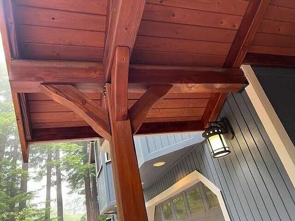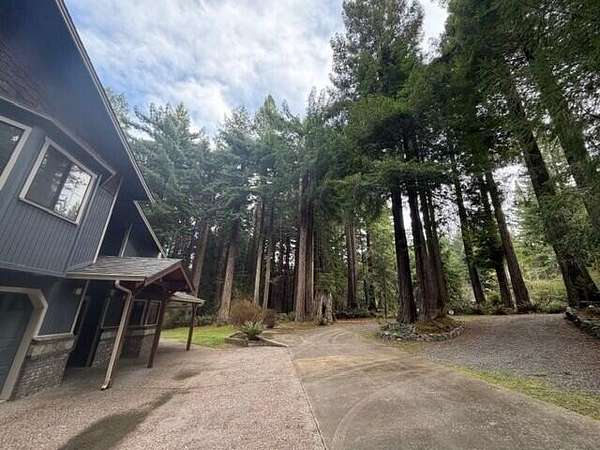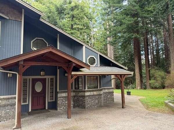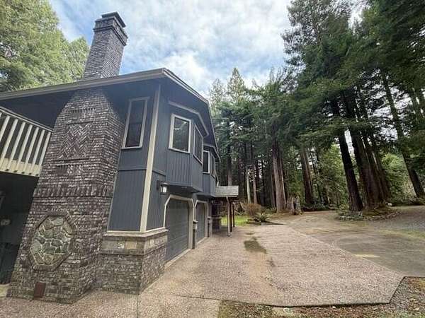 Custom-built contractor home blending rustic elegance with modern comfort, surrounded by towering redwoods for exceptional privacy and a true lodge-in-the-woods feel. The great room features soaring vaulted ceilings, skylights, and a dramatic floor-to-ceiling brick and stone fireplace. Natural wood, tile, stone, and marble accents add warmth and timeless craftsmanship throughout. The gourmet kitchen offers a gas range, marble countertops, custom oak cabinetry, and skylights. The spacious primary suite includes vaulted ceilings, private entrance and deck, walk-in closet, seating area, and a soaking tub with forest views. An open upstairs landing overlooks the main living space, while every room captures beautiful woodland views, creating a peaceful retreat.Motivated Seller! The spacious master suite is a true sanctuary, featuring its own private entrance and deck, vaulted ceilings, a cozy seating area, a generous walk-in closet, and a luxurious soaking tub that looks out onto the forest beyond. Every room in the house offers a unique view of the surrounding woodland, making nature a part of everyday life. An open upstairs landing overlooks the heart of the home
