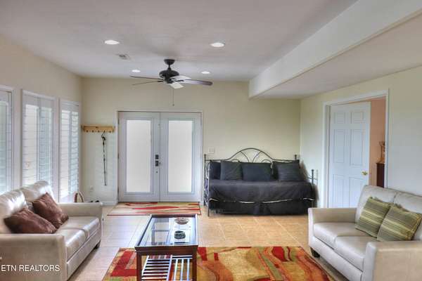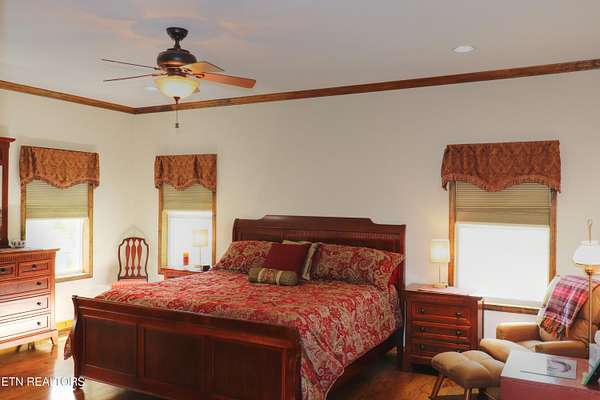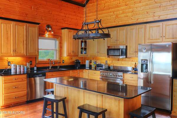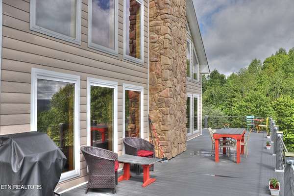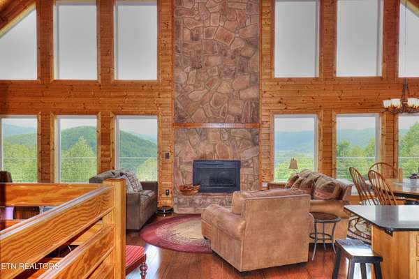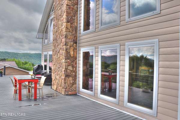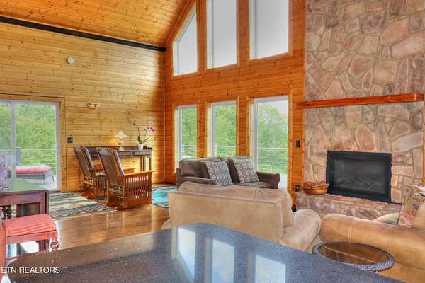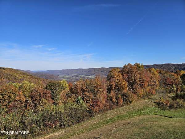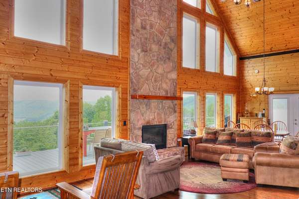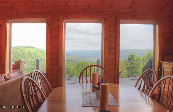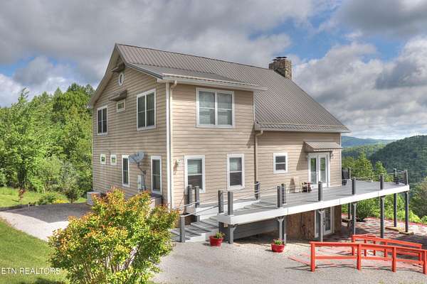 Escape to serenity in this one-of-a-kind mountaintop home offering breathtaking panoramic mountain views with total privacy on 23 wooded acres with pond. Located in peaceful East Tennessee, this tranquil setting is idea for rest, relaxation or working remotely-with fiber optic internet available. From the moment you step inside, you'll be captivated by the wall of windows showcasing the mountain views visible from both the interior and expansive Trex deck. The home's design features a vaulted ceiling, two story stone fireplace and tongue-and-groove pine plank walls that bring the outdoors in. The kitchen is appointed with Silestone countertops, custom cabinetry, stainless steel appliances and propane cooktop with components. The main-level primary ensuite offers a big walk-in tile shower, walk-in closet, laundry area and dual vanities. Engineered hardwood and custom finishes run throughout the home. The lower level is designed for relaxation and entertainment, boasting a wet bar, an antique Schrader wood stove, a dedicated office, a theater room and a utility room. The home offers zoned HVAC for year-round comfort as propane services the main and lower level, while heat pump efficiently manages the upper level. A private well supplies the homes and is equipped with two filtration systems. A detached studio or workshop offers heat, air and water. Come experience the tranquility and natural beauty of this mountain retreat-your private escape awaits you.
