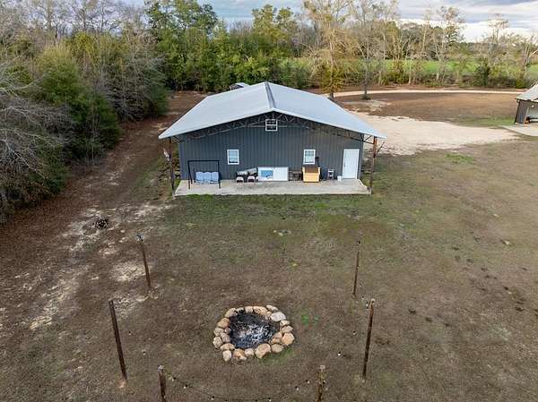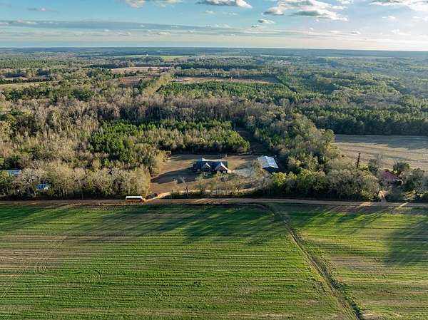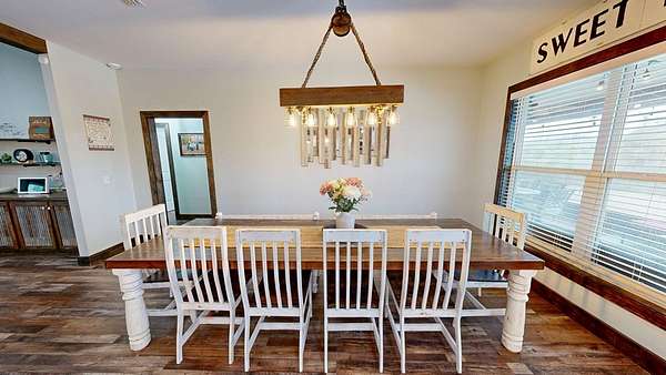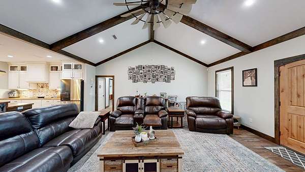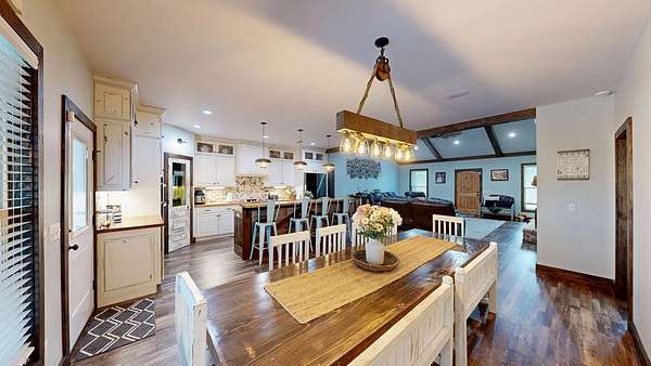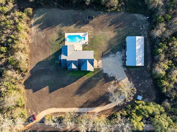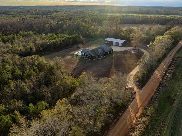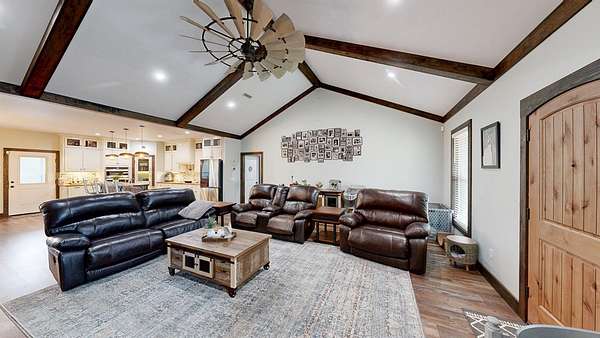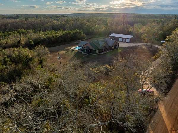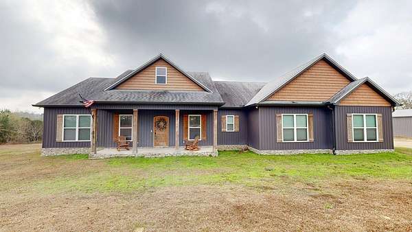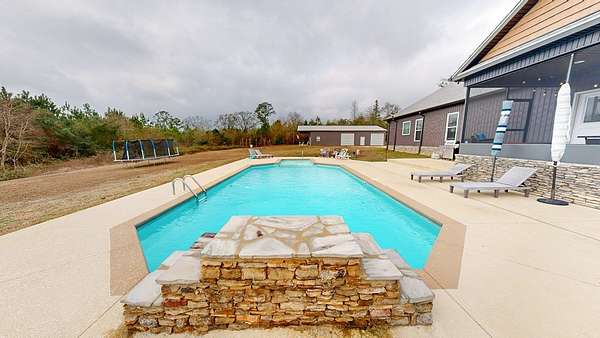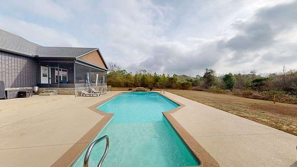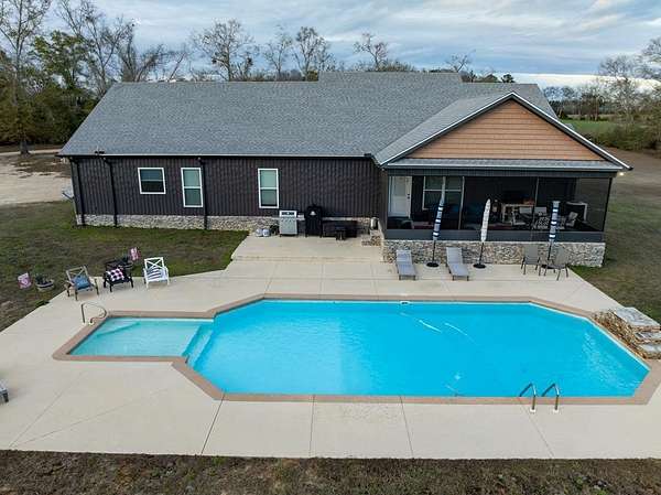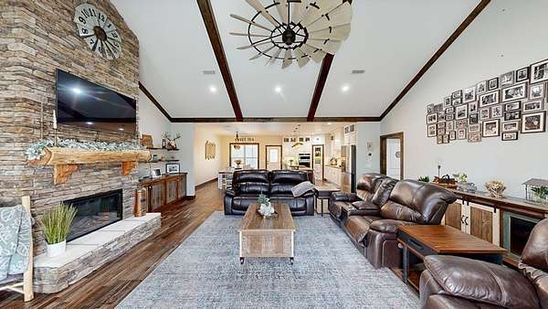Spacious custom-constructed executive home blending modern design with rustic accents. This one-story Craftsman showcases an open-concept floor plan combining living, dining, and kitchen spaces. The living room boasts cathedral ceilings with exposed beams and a floor-to-ceiling stacked stone fireplace with mantle and electric logs. The kitchen features a large island, wall oven, pot filler over the stovetop, wine cooler, and Aqua water filtration system. Hardwood floors run throughout--no carpet. A spacious laundry room and dedicated office add convenience. The split-bedroom layout offers two secondary bedrooms sharing a full hallway bath. Step out from the kitchen to a screened-in rear patio overlooking the pristine 16x32 inground vinyl-lined pool. Additional features include an oversized two-car garage and a 40x60 detached barn/shop on slab with two 12-ft roll-up doors. Situated on approx. 20 private acres with a nearby.