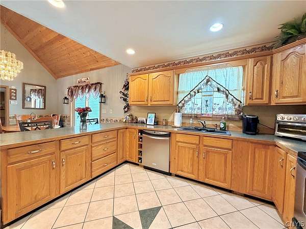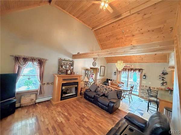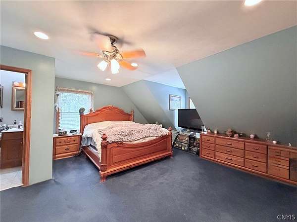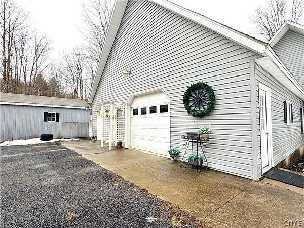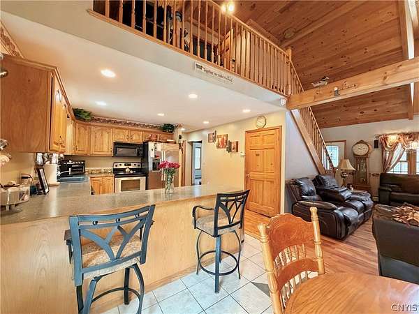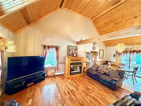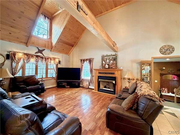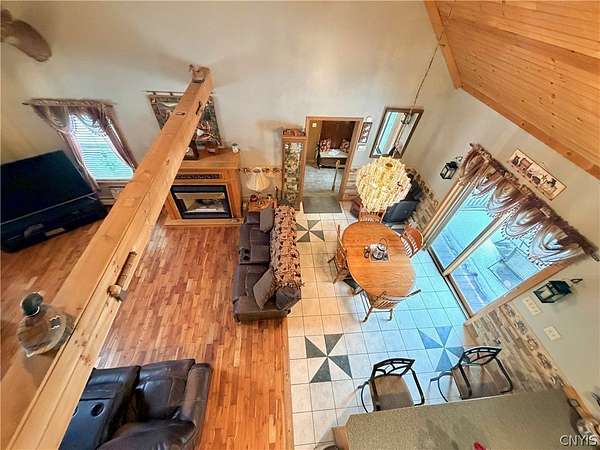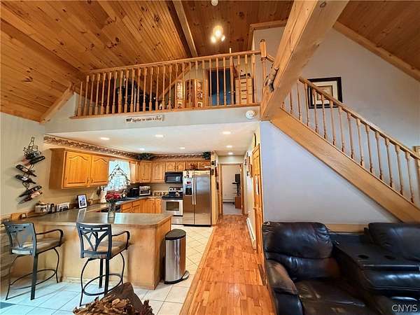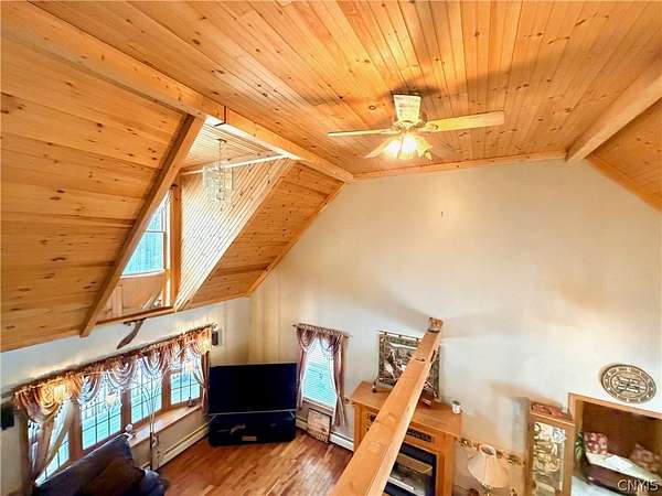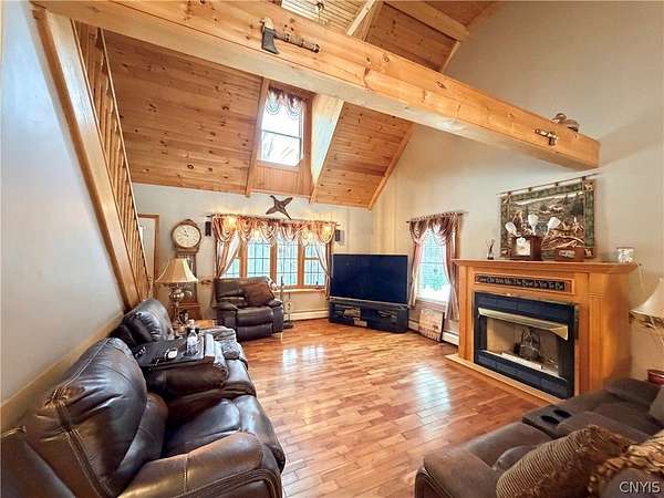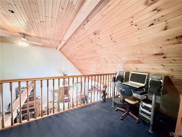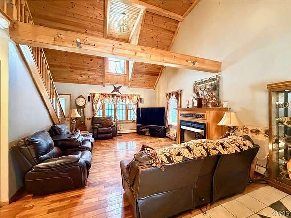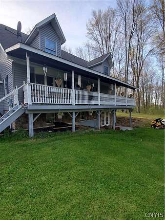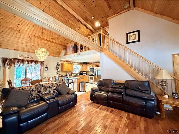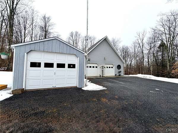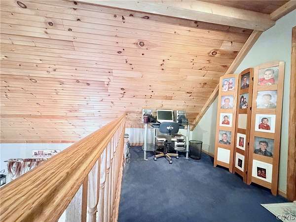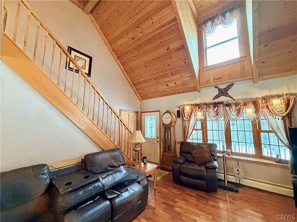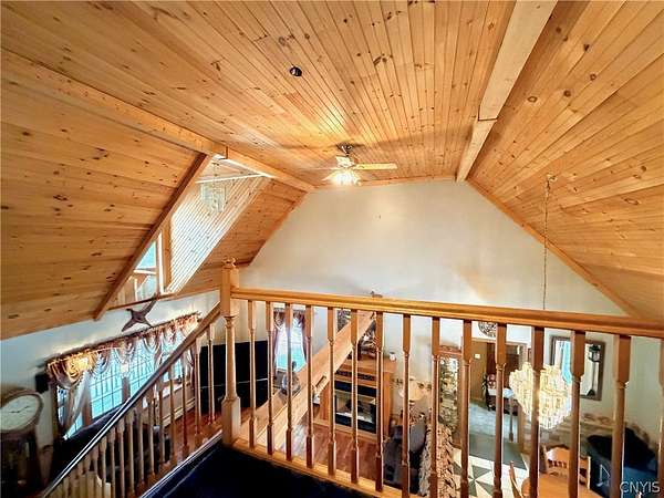 Tucked away on nearly 11 acres of private countryside, this beautifully maintained Cape-style home built in 2005 offers the perfect blend of rustic charm and modern layout. A long, flat driveway leads you far from the road to a peaceful setting surrounded by nature. Inside, you'll find three bedrooms and one and a half bathrooms, with warm natural woodwork that creates a cozy yet open feel throughout the home. The main living area features cathedral ceilings, stunning windowed dormers, and abundant natural light that fills the kitchen and living room. The second-floor primary suite overlooks the living space below and includes a lovely loft area, offering a perfect reading nook, office space, or relaxation retreat. The full walkout basement offers over 1,000 square feet of additional potential for finishing and expanding the living space. Additional highlights include a mudroom, a 2.5-car attached garage, and an additional one-car outbuilding ideal for storage, a workshop, or hobby space. Step outside to enjoy the covered deck overlooking the private yard, where nature surrounds you in every direction. The property also includes a pond that could easily be restored, along with a small hunting shed that has not been recently used and will convey as-is. Situated on 10.8 acres, this property offers space, privacy, and endless possibilities for enjoying country living while still being within convenient reach of nearby amenities. 12 minutes from shopping!