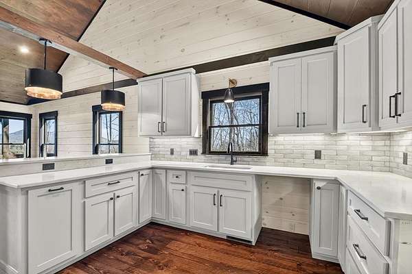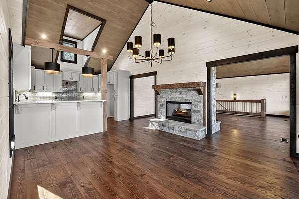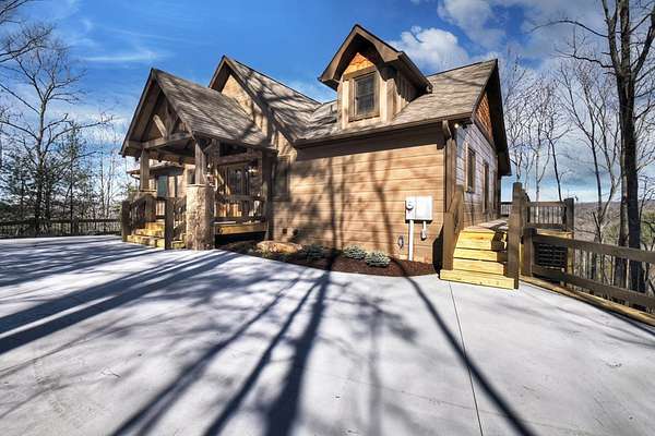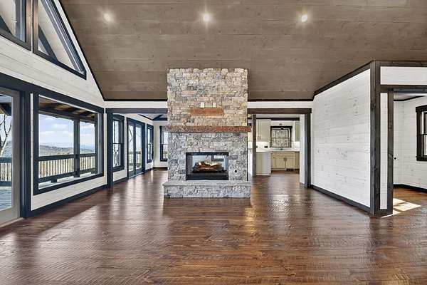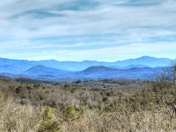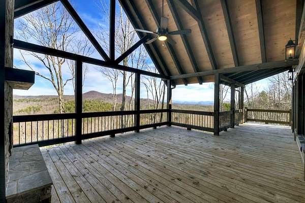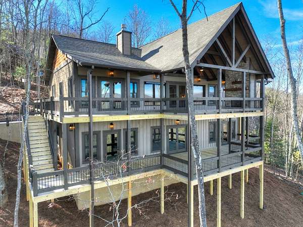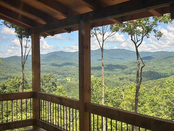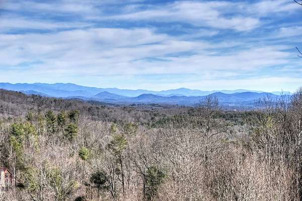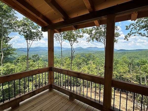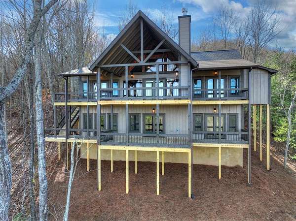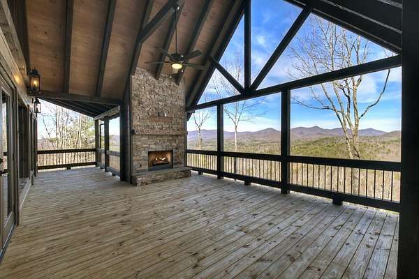 One of the MOST COMMANDING Long-Range, Multi-Layered Mountain Vistas ever available in Blue Ridge. Complete & Move-in Ready. "Panorama Vista" Stretches effortlessly across NC, GA & TN delivering a truly Rare & Dramatic Backdrop. Superior Quality NEW Construction in the Prestigious, Gated & Paved Mountain High Community. This Rustic Luxury Ranch offers a Concrete Driveway & Ample Parking. FOUR Bedroom Interior thoughtfully designed for Elegant ONE LEVEL Living complemented by a Fully Finished Terrace level ideal for Guests. The Main Living area showcases an OPEN DESIGN w/Great Room & Dining Room anchored by a Striking TWO SIDED Stone Fireplace. Gable Fixed Glass Windows & Glass Door Panels flood the interior with Natural Light from Gables on Both Sides. A Dramatic "Wall of Glass" opens seamlessly to the oversized OPEN GABLE COVERED Entertaining Porch complete with an EXTERIOR STONE FIREPLACE--an ideal setting for sophisticated gatherings or quiet evenings overlooking these BREATHTAKING WIDE Mountain Views. The Custom Kitchen is both Functional & Beautiful featuring Granite countertops, an expansive counter-height Bar, Custom Cabinetry & Premium finishes throughout. The Owner's Master Suite is a private retreat with Direct Porch Access, a spacious walk-in closet, double vanity & an Oversized Full Tiled Shower & Tub. A Well-Appointed laundry room w/Granite Counters & utility sink along with a Stylish Guest Powder Room completes the Main Level. A Finished terrace level offers a Wet Bar, Generous Family Bonus Room with 3rd STONE Fireplace, Three Guest Bedrooms & TWO full Baths (Full Tile Shower) including a "Second Suite" ideal for Guests or Multi-Generational living. Architectural details include Rich Wood textures, Wainscoting, Accent Walls, Contrasting Stain Selections, Wrought Iron Pickets & Contemporary Lighting. Zoned HVAC ensures year-round comfort. An Exterior Staircase connects the Wrap-around Main Level Porch to the Terrace Level Porch. Professional Landscaping