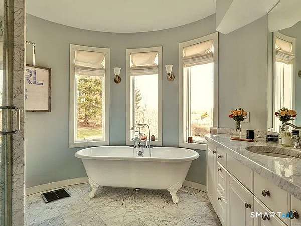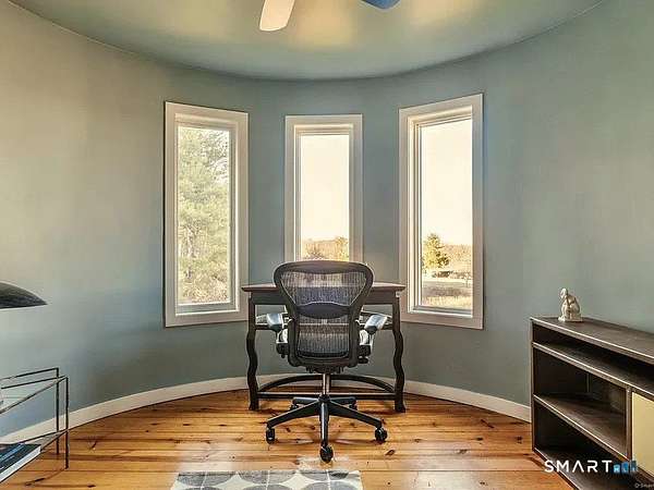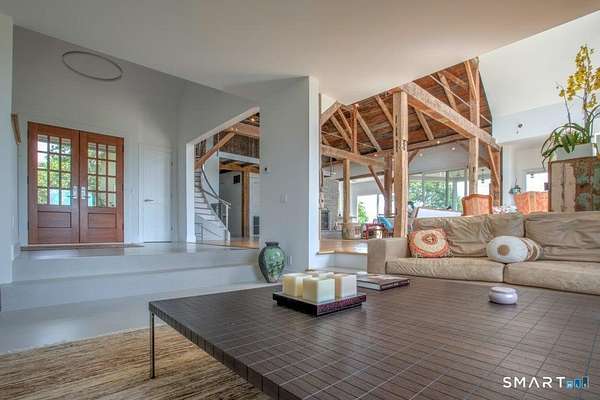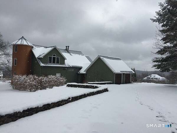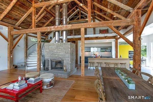 Academic or yearly rental. Tucked at the end of a winding, tree-lined road, the property offers rare privacy and a peaceful Litchfield County escape. Originally a 19th-century barn, the home has been beautifully reconstructed as a warm, design-forward retreat. Reclaimed barnwood, hand-hewn beams, and wide-plank floors preserve its character, while soaring ceilings and modern finishes create bright, comfortable living spaces. The dramatic great room is anchored by a floor-to-ceiling, double sided, fieldstone fireplace and large windows that bring the surrounding landscape inside. A sleek kitchen with integrated appliances, induction cooktop, and generous island opens to the living and dining areas, making summer gatherings effortless. A sunken den offers a cozy spot for movie nights or quiet afternoons. Four bedrooms and two-and-a-half baths include a ground-floor primary suite. In a striking architectural detail, the home's bathrooms are housed within the original silo, with a charming lofted nook at the top-perfect for reading or remote work. Enjoy the outdoors-by the heated Gunite pool and spa, large screen porch & a surrounded by five private acres of lawn and woodland set high on a hill with distant views of the rolling Litchfield Hills. Minutes from Bantam Lake, White Memorial Conservation Center, and the shops and restaurants of Litchfield, Bantam & New Preston. The Bantam Barn is a private and memorable summer retreat in the heart of the Litchfield Hills! Perfection!