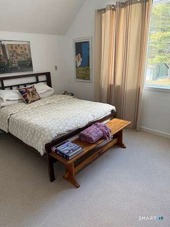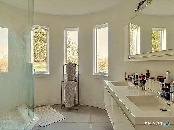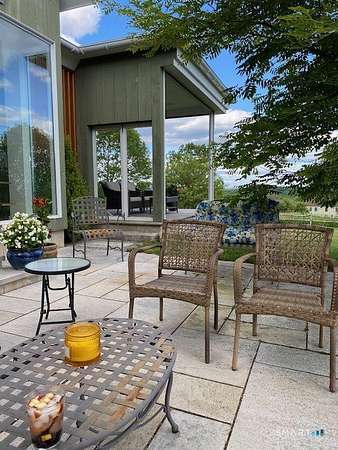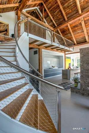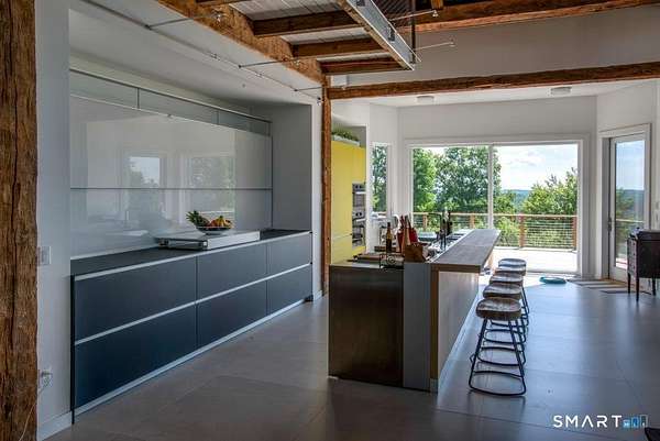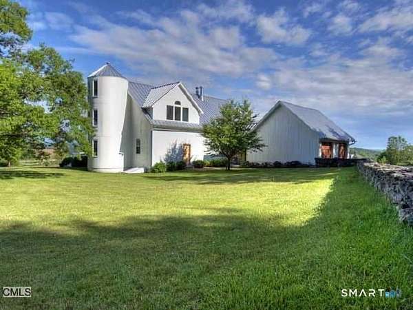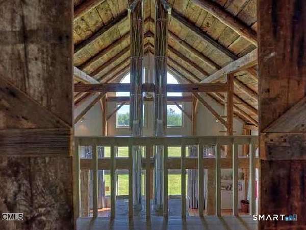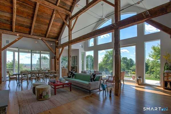 Summer at The Bantam Barn begins outdoors-by the heated, Gunite pool and spa, surrounded by nearly five private acres of lawn and woodland set high on a hill with distant views of the rolling Litchfield Hills. Tucked at the end of a winding, tree-lined road, the property offers rare privacy and a peaceful escape. Originally a 19th-century barn, the home has been beautifully reconstructed as a warm, design-forward retreat. Reclaimed barnwood, hand-hewn beams, and wide-plank floors preserve its character, while soaring ceilings and modern finishes create bright, comfortable living spaces. The dramatic great room is anchored by a floor-to-ceiling fieldstone fireplace and large windows that bring the surrounding landscape inside. A sleek kitchen with integrated appliances, induction cooktop, and generous island opens to the living and dining areas, making summer gatherings effortless. A sunken den offers a cozy spot for movie nights or quiet afternoons. Four bedrooms and two-and-a-half baths include a ground-floor primary suite with walk-in closet. In a striking architectural detail, the home's bathrooms are housed within the original silo, with a charming lofted nook at the top-perfect for reading or remote work. Minutes from Bantam Lake, White Memorial Conservation Center, and the shops and restaurants of Litchfield, Bantam, New Preston and Washington. The Bantam Barn is a private and memorable summer retreat in the heart of the Litchfield Hills.