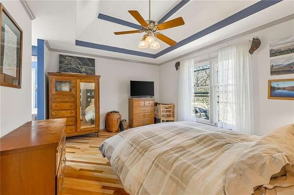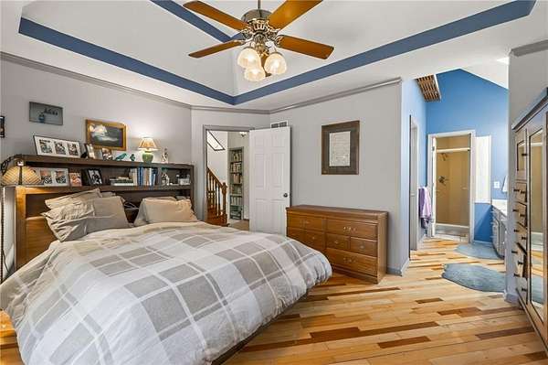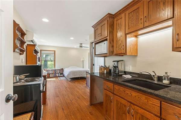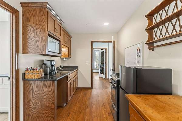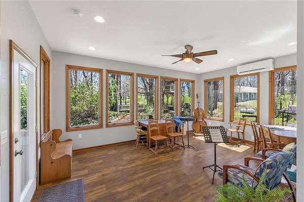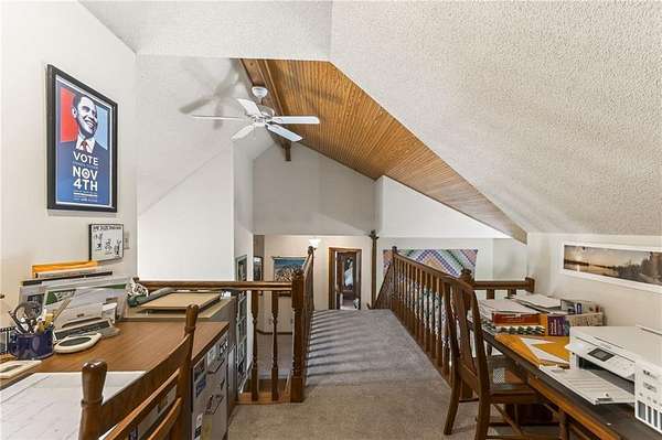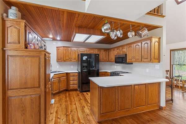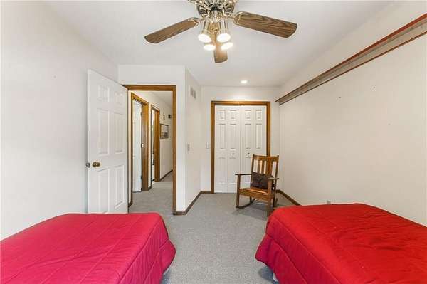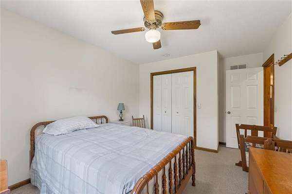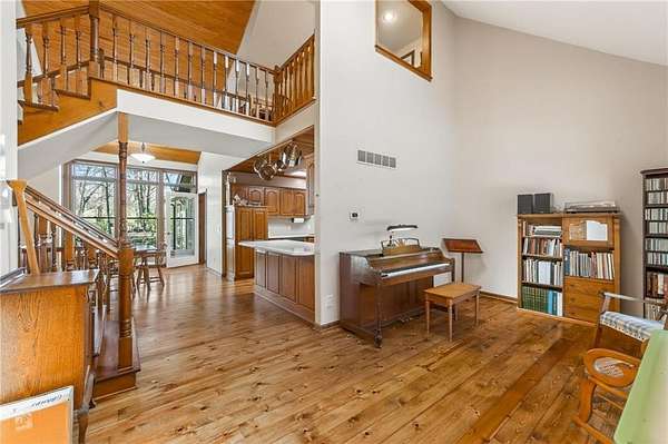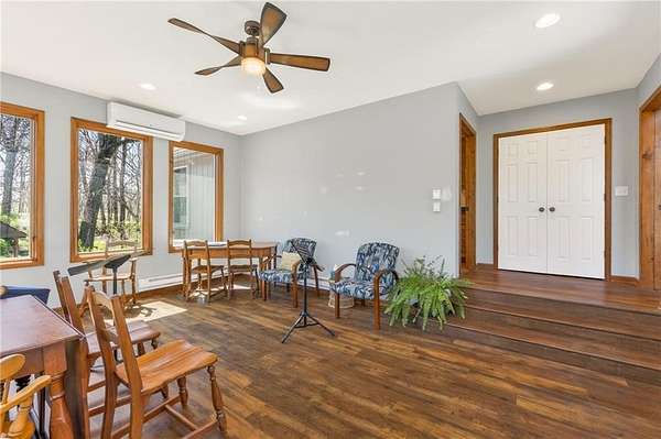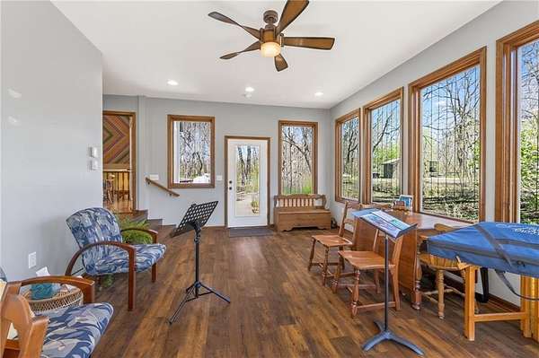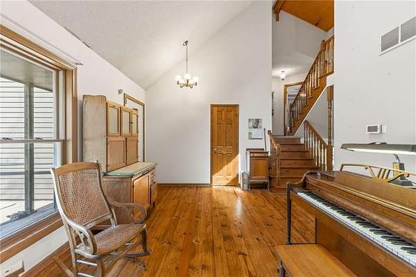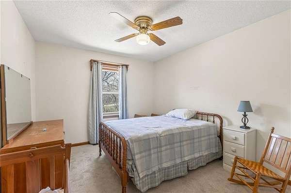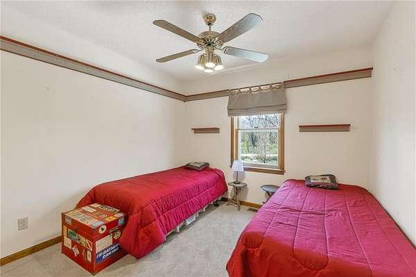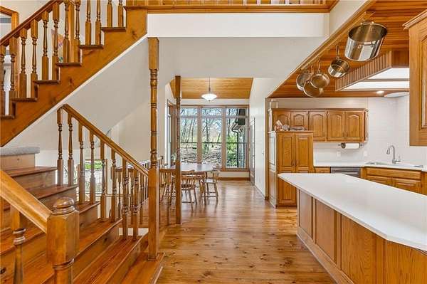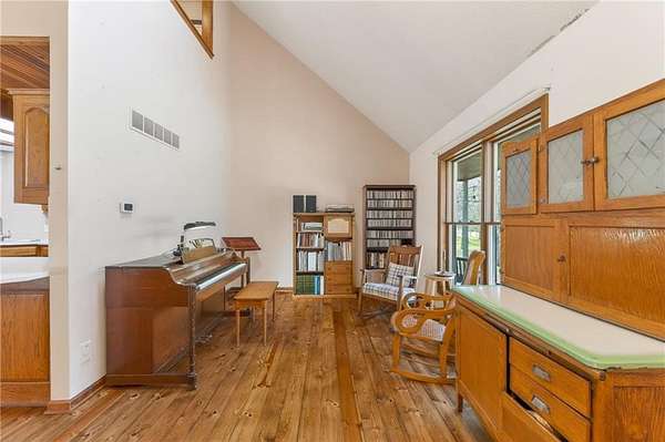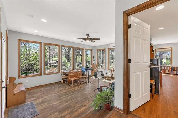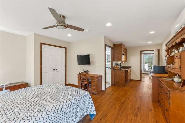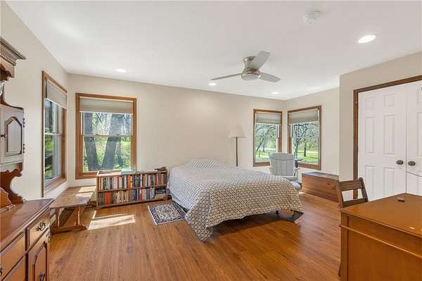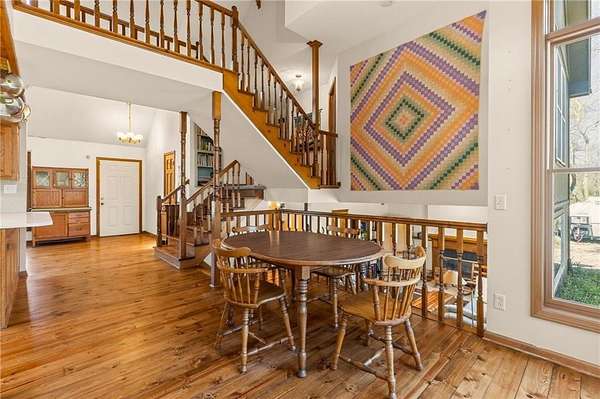 Situated on 4.8 acres in rural Clay County, this updated country home offers modern comforts in a tranquil setting. The spacious 3,924 sq ft interior (4 beds, 3 baths) was refreshed with refinished wood floors. Inside, the open kitchen boasts quartz countertops, an island workspace, and flows seamlessly into a bright dining area. The cozy family room is naturally brightened by light from the Pella windows overlooking the scenic backyard. Upstairs, the luxurious primary suite includes a private bath, walk-in closet, with two more upstairs bedrooms and a second full bath completing the upper level. A standout feature is a main-level multigenerational suite - essentially a self-contained apartment - providing a private bedroom, full bath and a convenient kitchenette with small appliances. Outside, enjoy peaceful country life on grounds ideal for farm animals, vegetable gardening, and play. Mature trees and perennial flowerbeds add year-round beauty, and a detached shop provides extra workspace or storage. In the coveted Kearney School District, this turnkey home combines tranquil country charm with a versatile layout. Its integrated multigenerational suite truly makes it perfect for extended-family living or hosting guests.