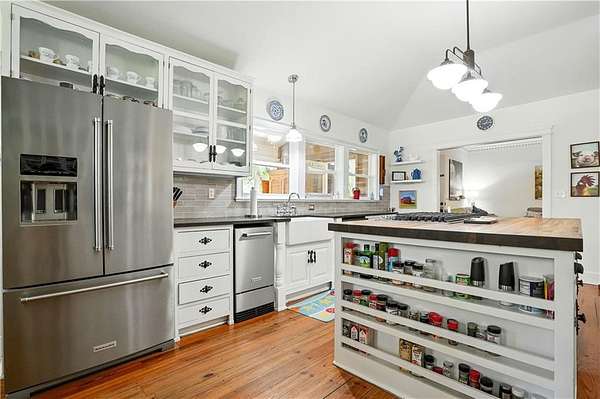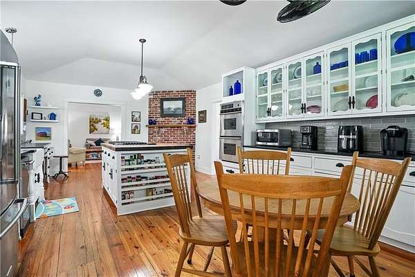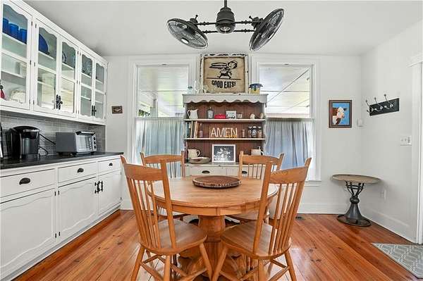 Arrival begins along a brick-lined drive, where double front porches offer an inviting glimpse of the warmth within. Inside, original heart pine floors set the tone, complemented by a cozy family room with a fireplace, a formal dining room with its own fireplace, and a sunroom ideal for morning coffee or quiet afternoons with a book. The country-style kitchen serves as the heart of the home, featuring a large center island with gas cooking and generous space for gathering and entertaining.